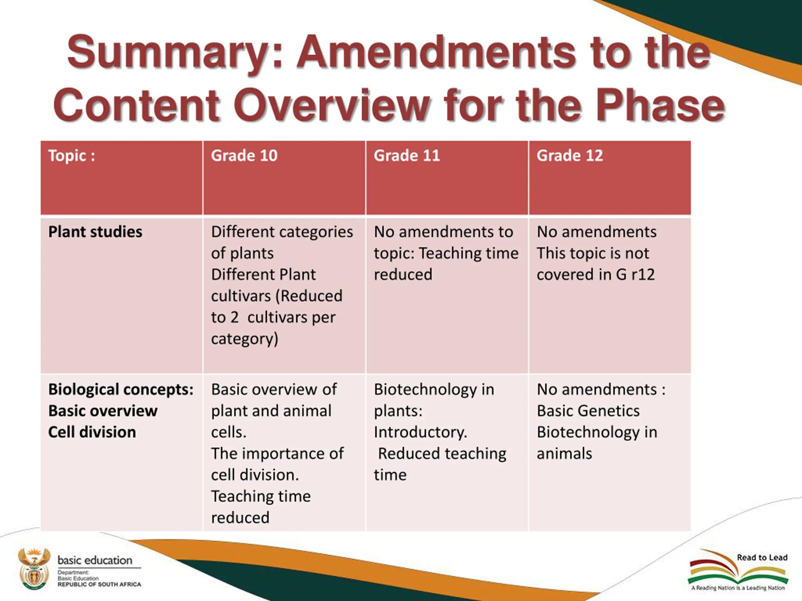 Summary: Amendments to the Content Overview for the Phase Topic : Grade 10 Grade 11 Grade 12 Plant studies Different categories of plants Different Plant cultivars (Reduced to 2 cultivars per category) No amendments to topic: Teaching time reduced No amendments This topic is not covered in G r12 Biological concepts: Basic overview Cell division Basic overview of plant and animal cells. The importance of cell division. Teaching time reduced Biotechnology in plants: Introductory. Reduced teaching time No amendments : Basic Genetics Biotechnology in animals