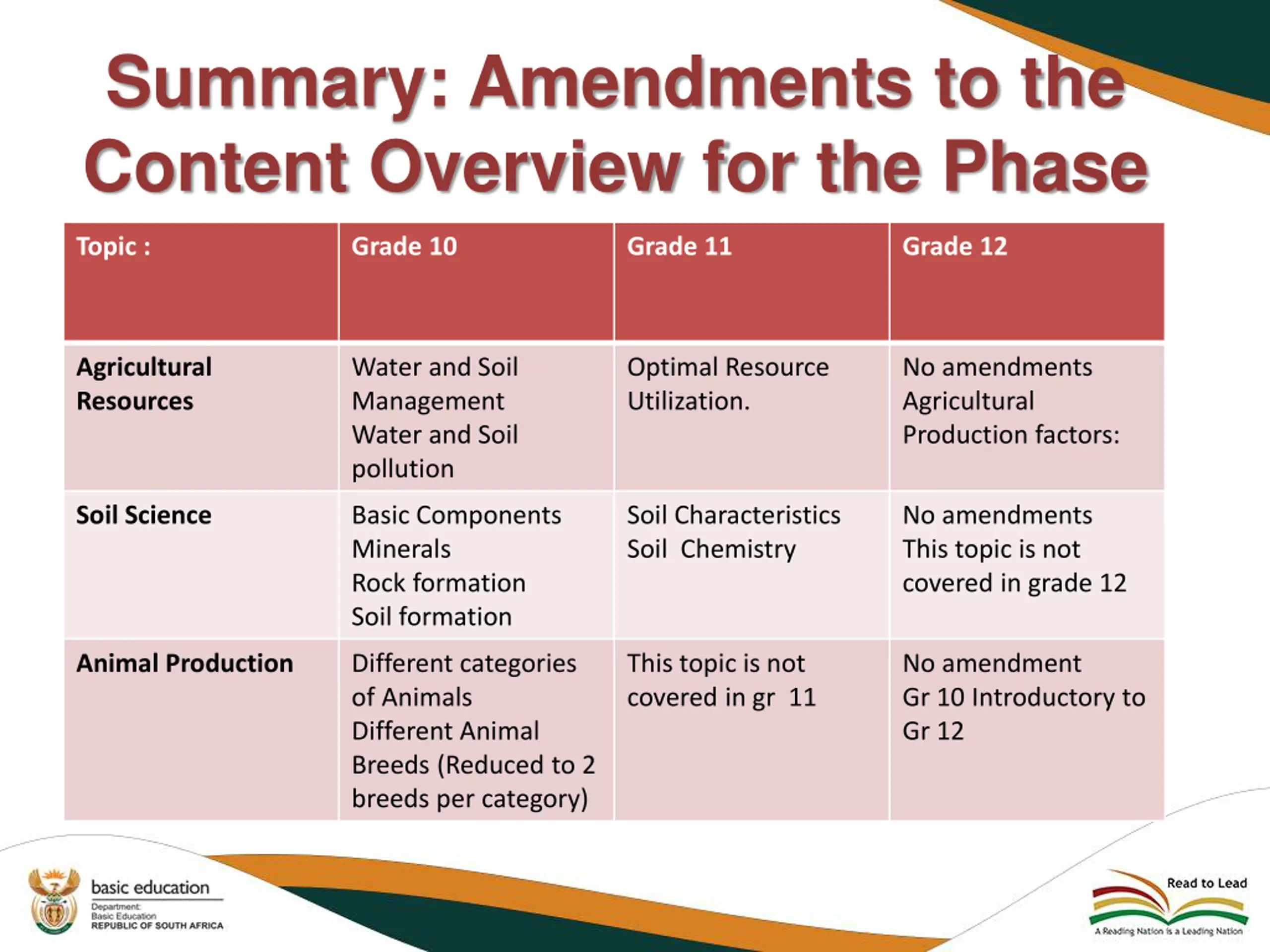 Summary: Amendments to the Content Overview for the Phase Topic : Grade 10 Grade 11 Grade 12 Agricultural Resources Water and Soil Management Water and Soil pollution Optimal Resource Utilization. No amendments Agricultural Production factors: Soil Science Basic Components Minerals Rock formation Soil formation Soil Characteristics Soil Chemistry No amendments This topic is not covered in grade 12 Animal Production Different categories of Animals Different Animal Breeds (Reduced to 2 breeds per category) This topic is not covered in gr 11 No amendment Gr 10 Introductory to Gr 12