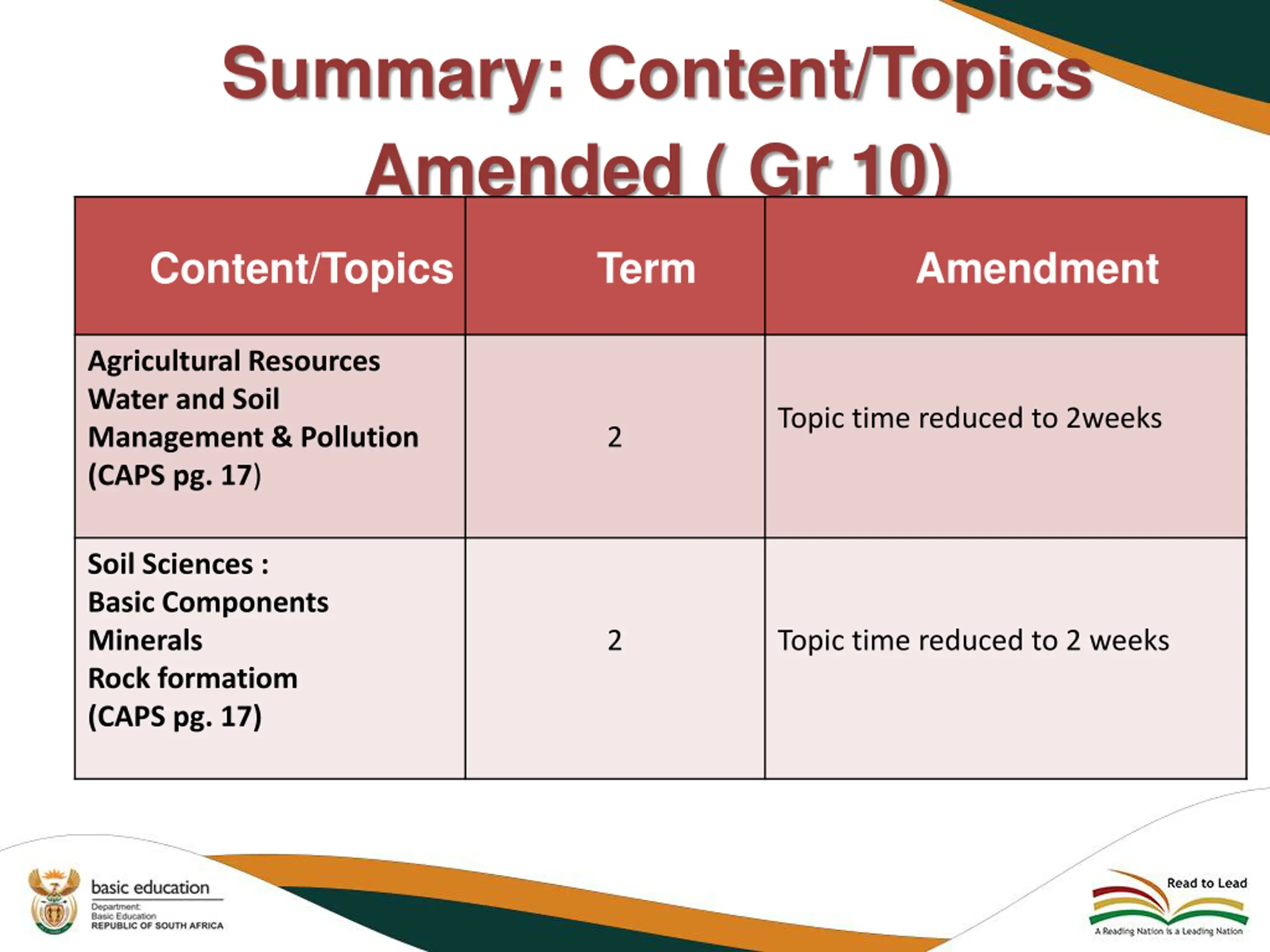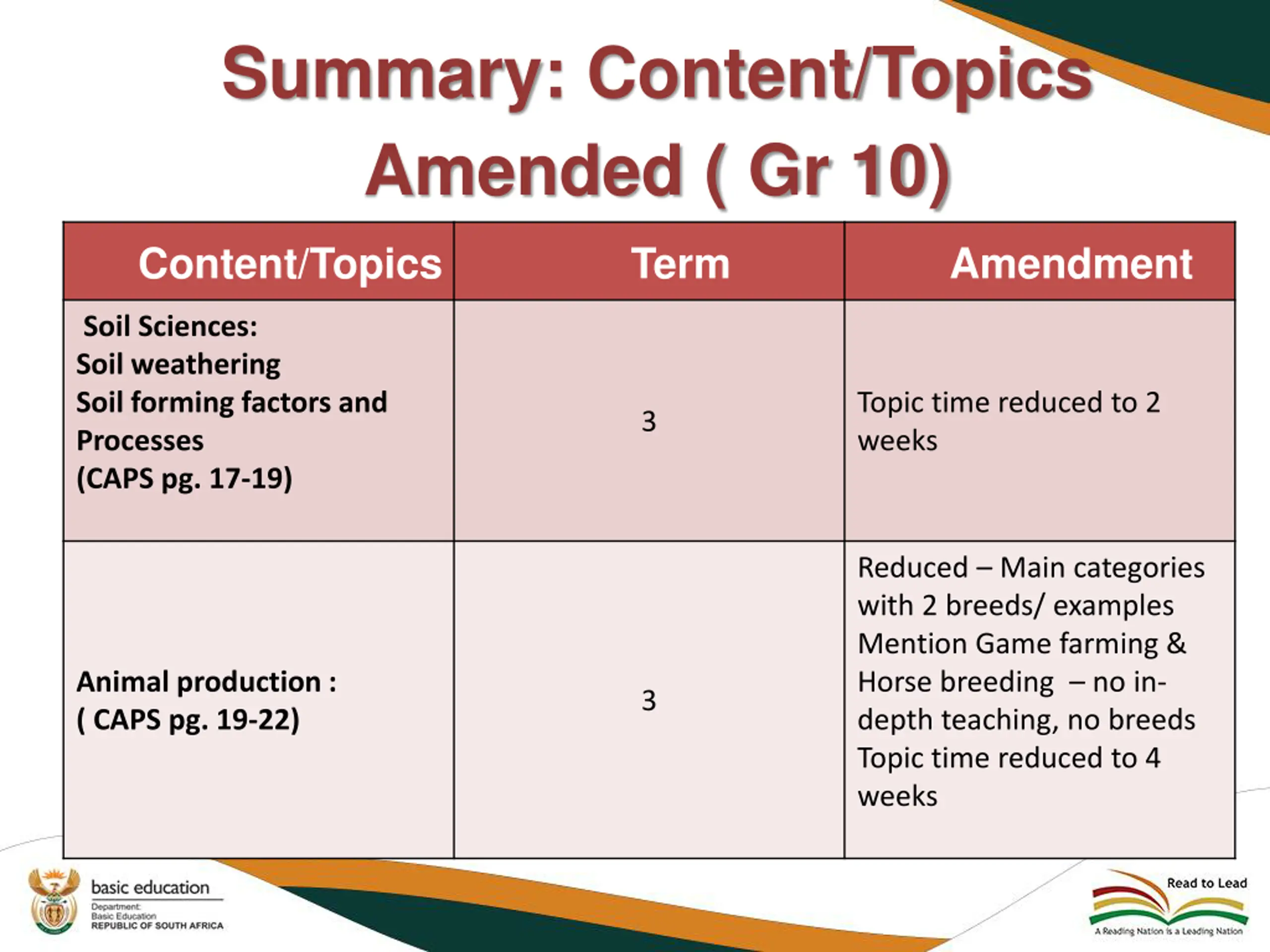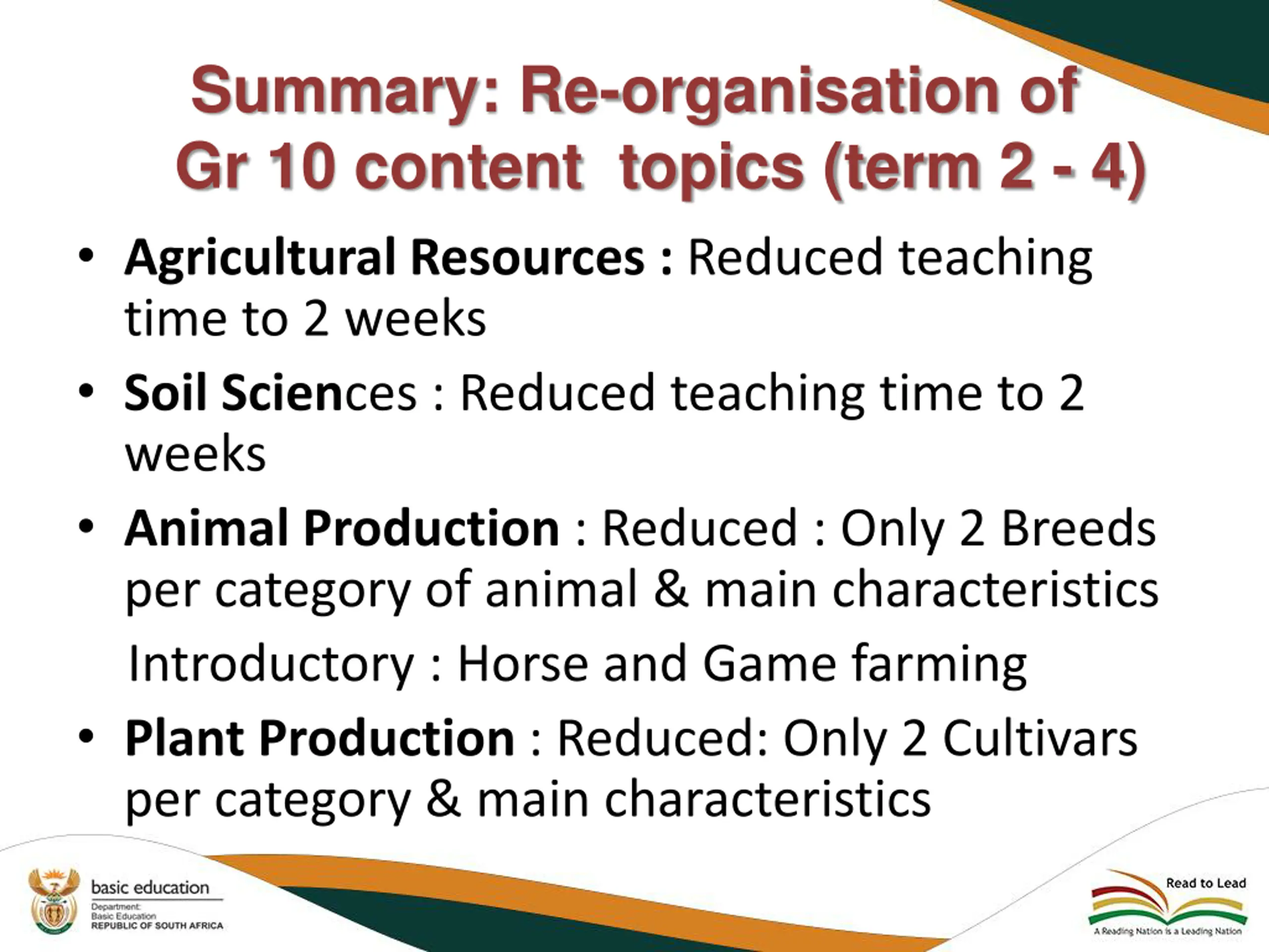 Summary: Re-organisation of Gr 10 content topics (term 2 - 4) Agricultural Resources : Reduced teaching time to 2 weeks Soil Sciences : Reduced teaching time to 2 weeks Animal Production : Reduced : Only 2 Breeds per category of animal & main characteristics Introductory : Horse and Game farming Plant Production : Reduced: Only 2 Cultivars per category & main characteristics