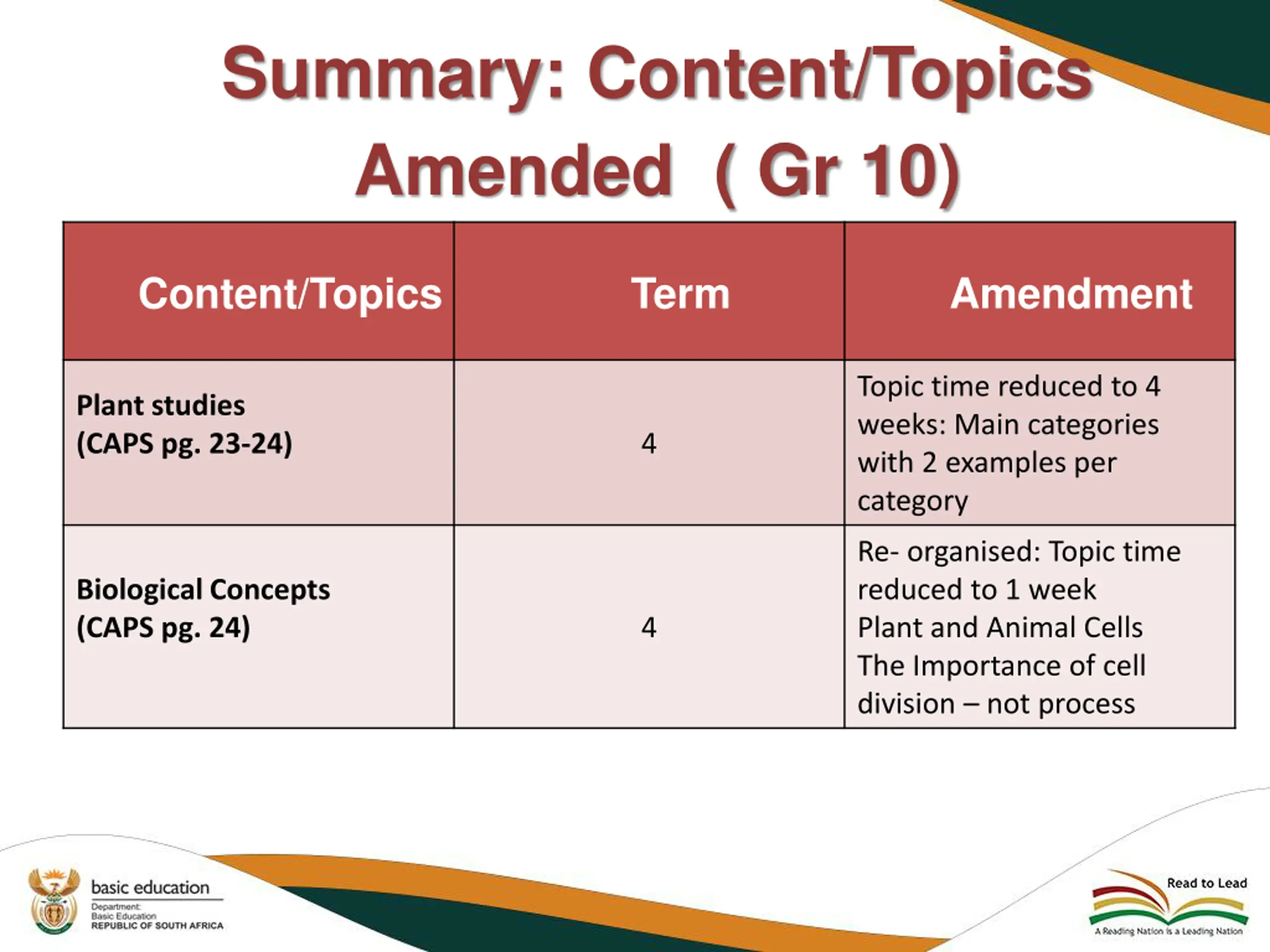 Summary: Content/Topics Amended ( Gr 10) Content/Topics Term Amendment Topic time reduced to 4 weeks: Main categories with 2 examples per category Plant studies (CAPS pg. 23-24) 4 Re- organised: Topic time reduced to 1 week Plant and Animal Cells The Importance of cell division not process Biological Concepts (CAPS pg. 24) 4