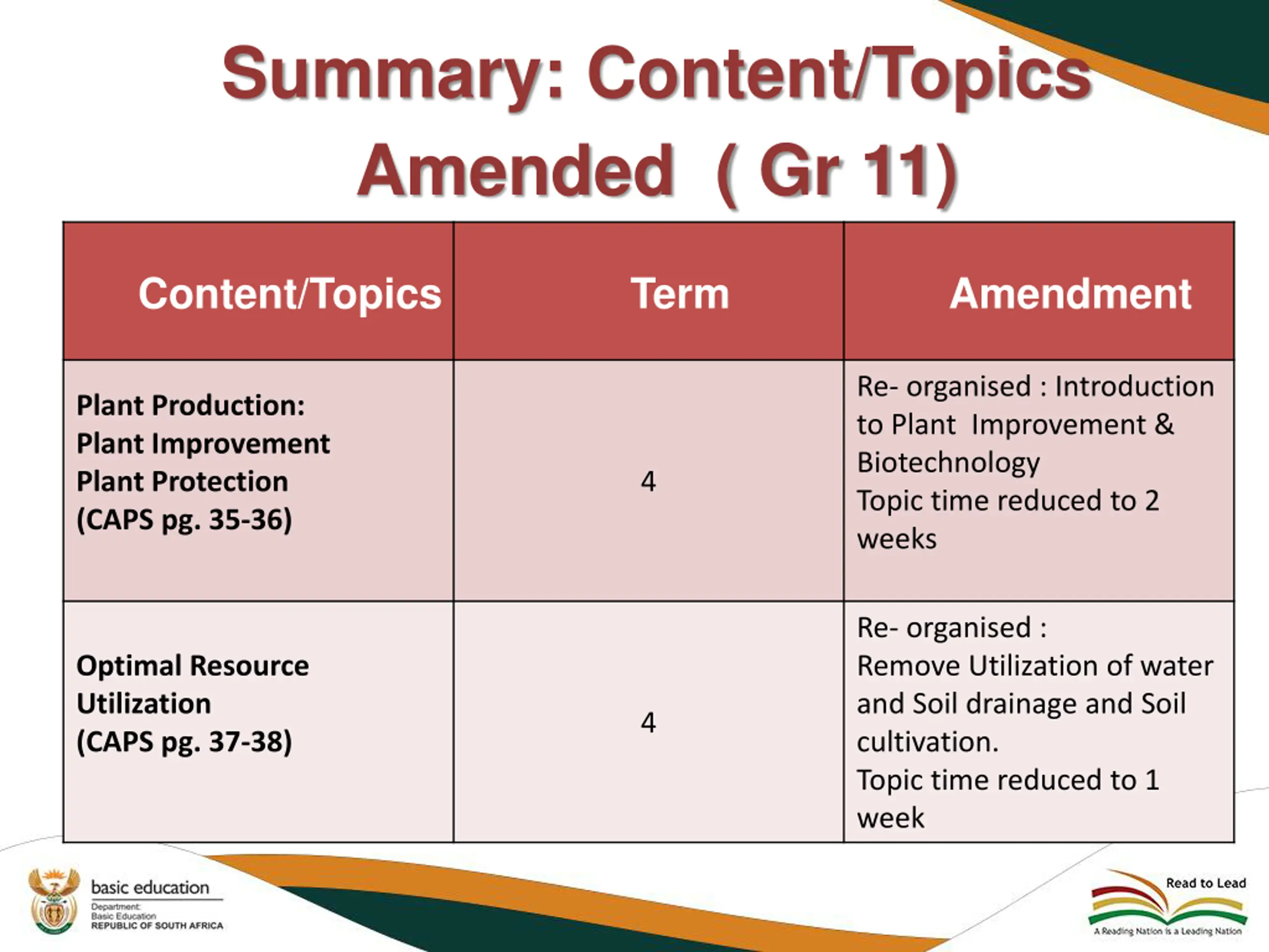 Summary: Content/Topics Amended ( Gr 11) Content/Topics Term Amendment Re- organised : Introduction to Plant Improvement & Biotechnology Topic time reduced to 2 weeks Plant Production: Plant Improvement Plant Protection (CAPS pg. 35-36) 4 Re- organised : Remove Utilization of water and Soil drainage and Soil cultivation. Topic time reduced to 1 week Optimal Resource Utilization (CAPS pg. 37-38) 4