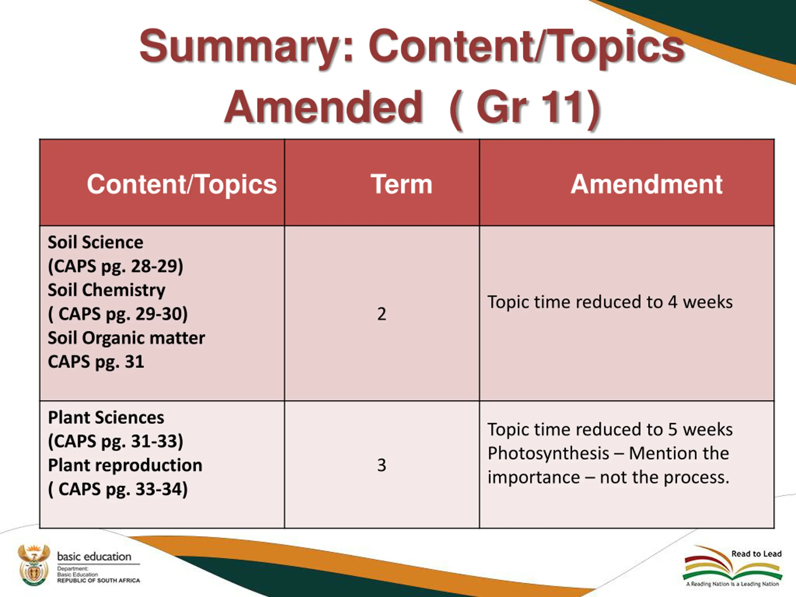 Summary: Content/Topics Amended ( Gr 11) Content/Topics Term Amendment Soil Science (CAPS pg. 28-29) Soil Chemistry ( CAPS pg. 29-30) Soil Organic matter CAPS pg. 31 Topic time reduced to 4 weeks 2 Plant Sciences (CAPS pg. 31-33) Plant reproduction ( CAPS pg. 33-34) Topic time reduced to 5 weeks Photosynthesis Mention the importance not the process. 3