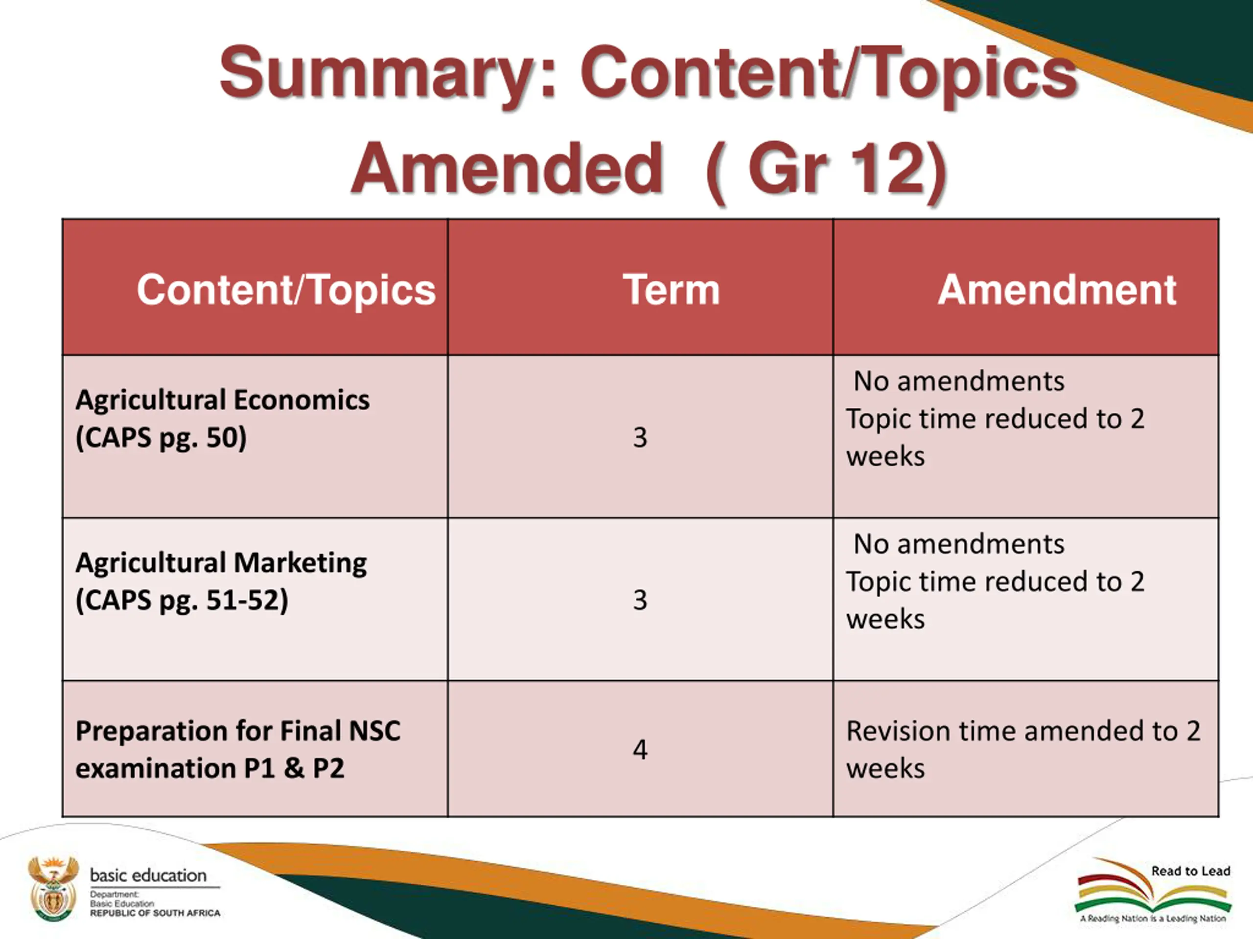 Summary: Content/Topics Amended ( Gr 12) Content/Topics Term Amendment No amendments Topic time reduced to 2 weeks Agricultural Economics (CAPS pg. 50) 3 No amendments Topic time reduced to 2 weeks Agricultural Marketing (CAPS pg. 51-52) 3 Preparation for Final NSC examination P1 & P2 Revision time amended to 2 weeks 4