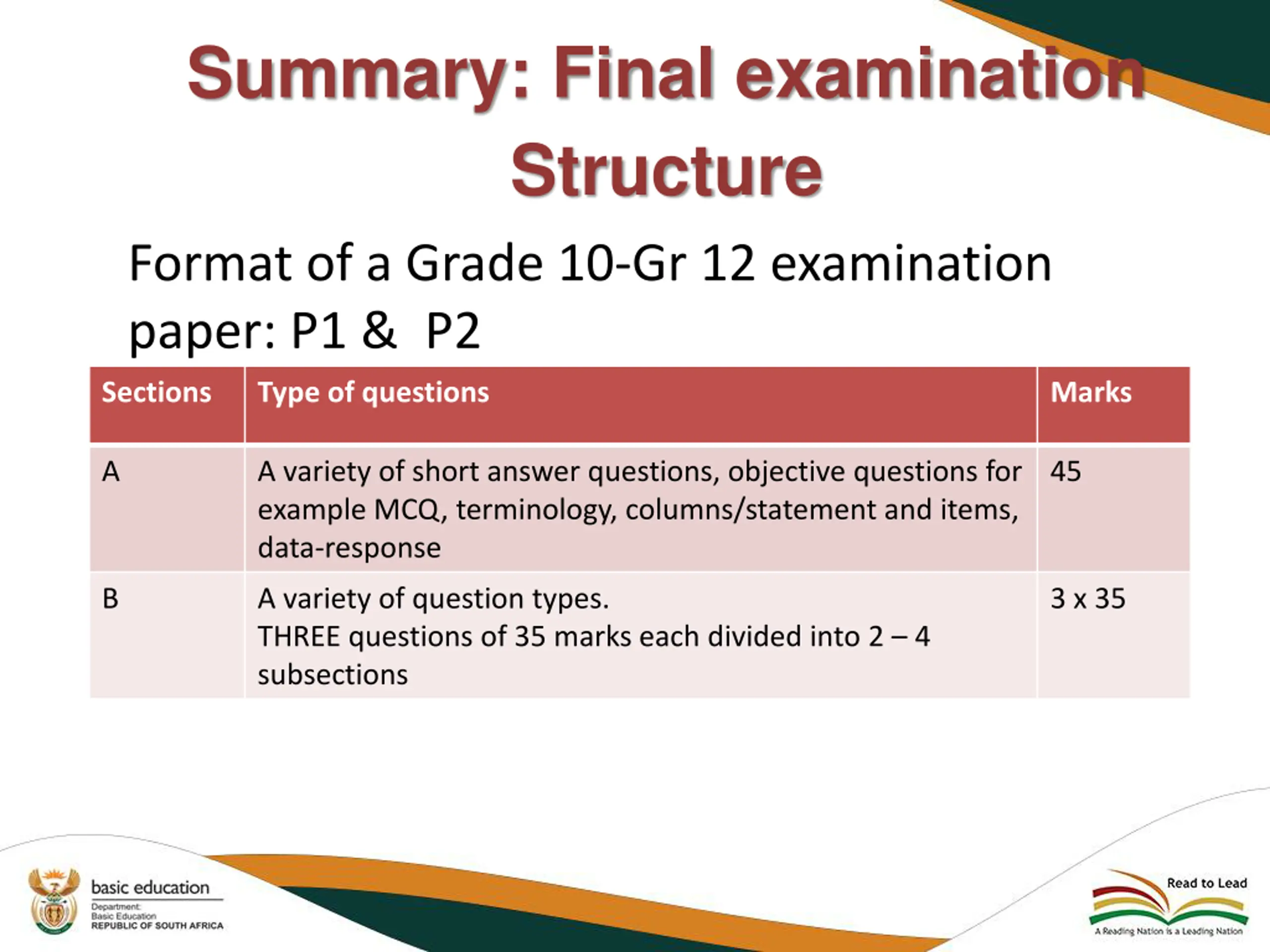 Summary: Final examination Structure Format of a Grade 10-Gr 12 examination paper: P1 & P2 Sections Type of questions Marks A A variety of short answer questions, objective questions for example MCQ, terminology, columns/statement and items, data-response 45 B A variety of question types. THREE questions of 35 marks each divided into 2 4 subsections 3 x 35
