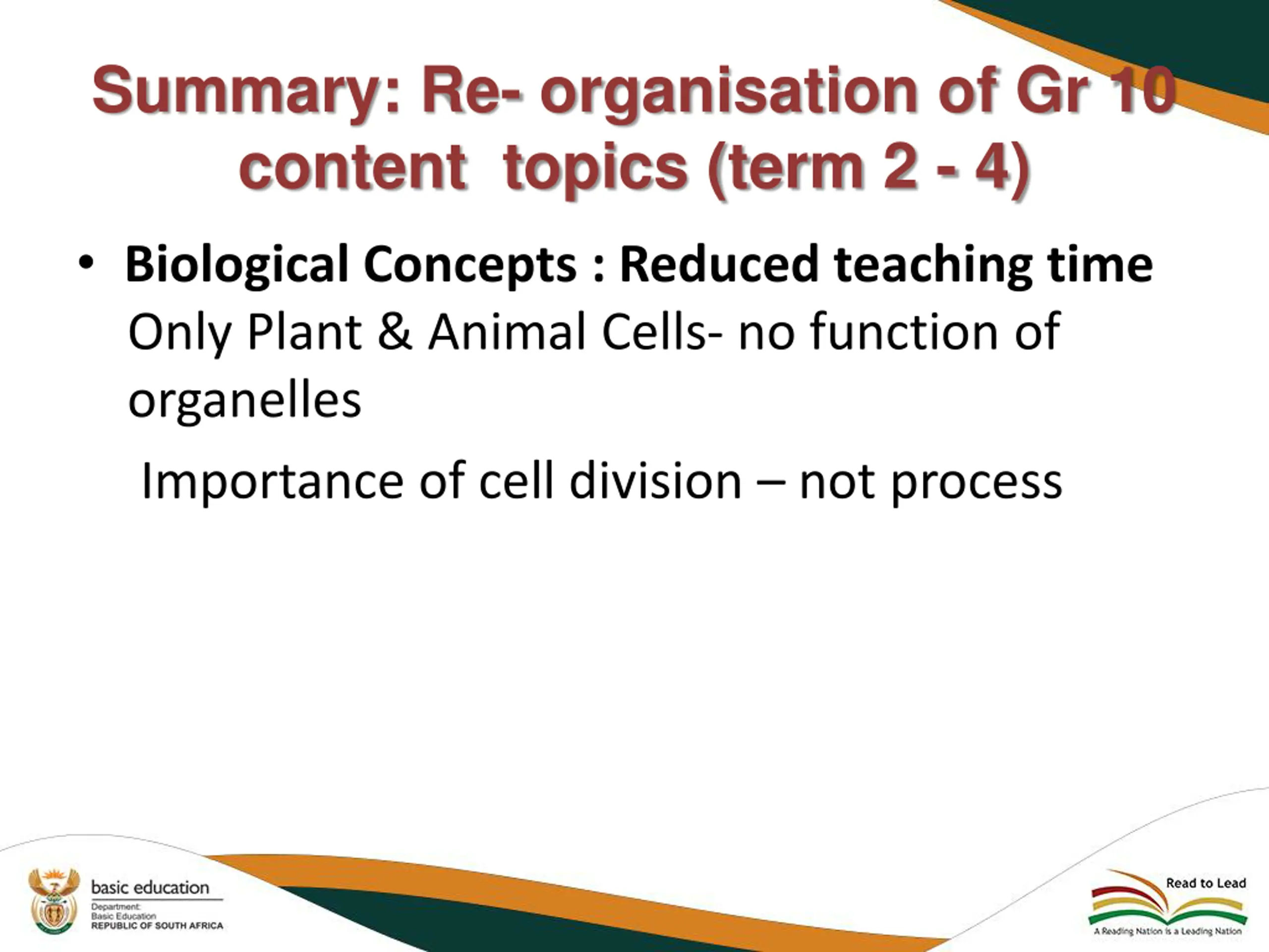 Summary: Re- organisation of Gr 10 content topics (term 2 - 4) Biological Concepts : Reduced teaching time Only Plant & Animal Cells- no function of organelles Importance of cell division not process