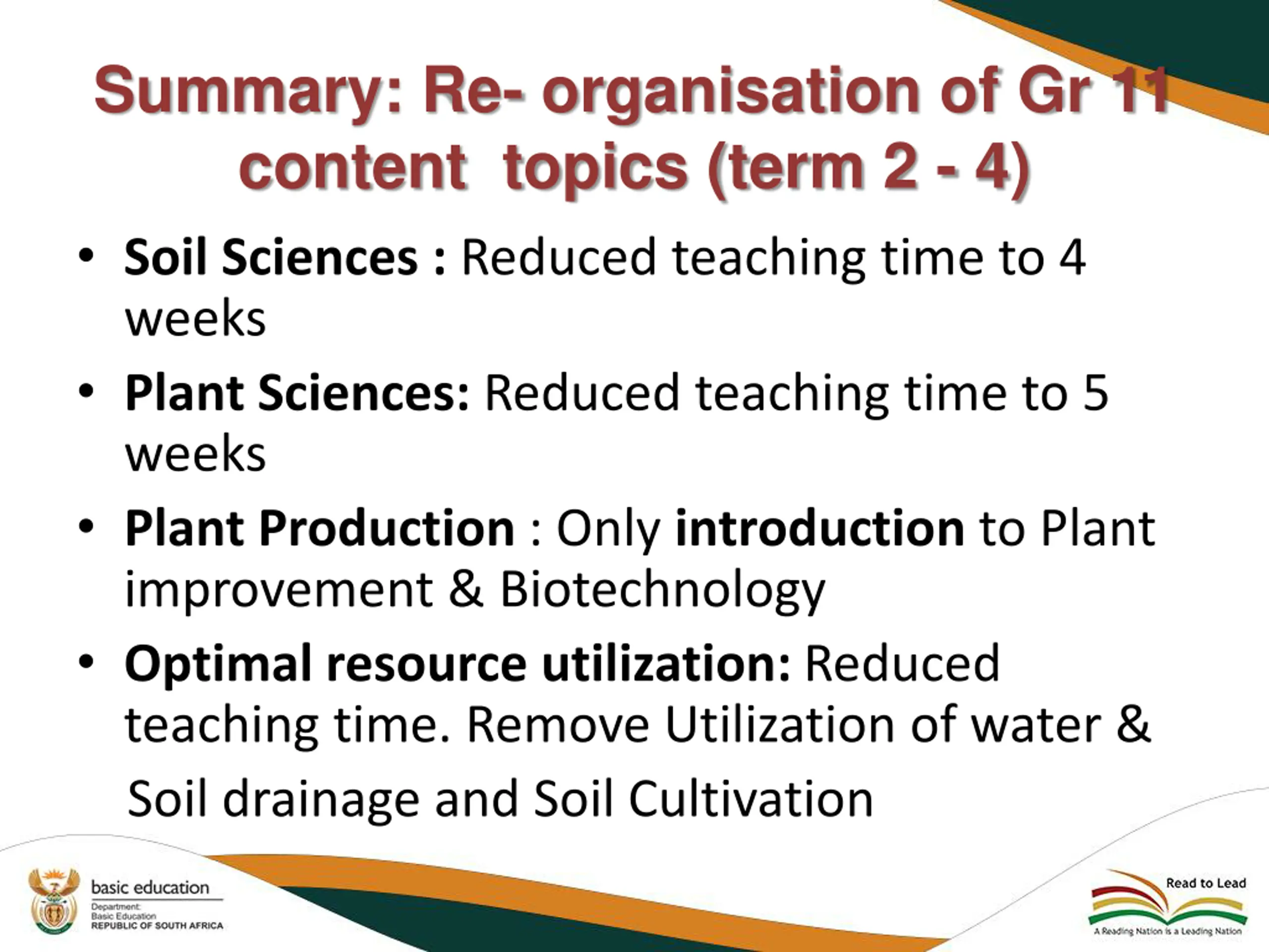 Summary: Re- organisation of Gr 11 content topics (term 2 - 4) Soil Sciences : Reduced teaching time to 4 weeks Plant Sciences: Reduced teaching time to 5 weeks Plant Production : Only introduction to Plant improvement & Biotechnology Optimal resource utilization: Reduced teaching time. Remove Utilization of water & Soil drainage and Soil Cultivation
