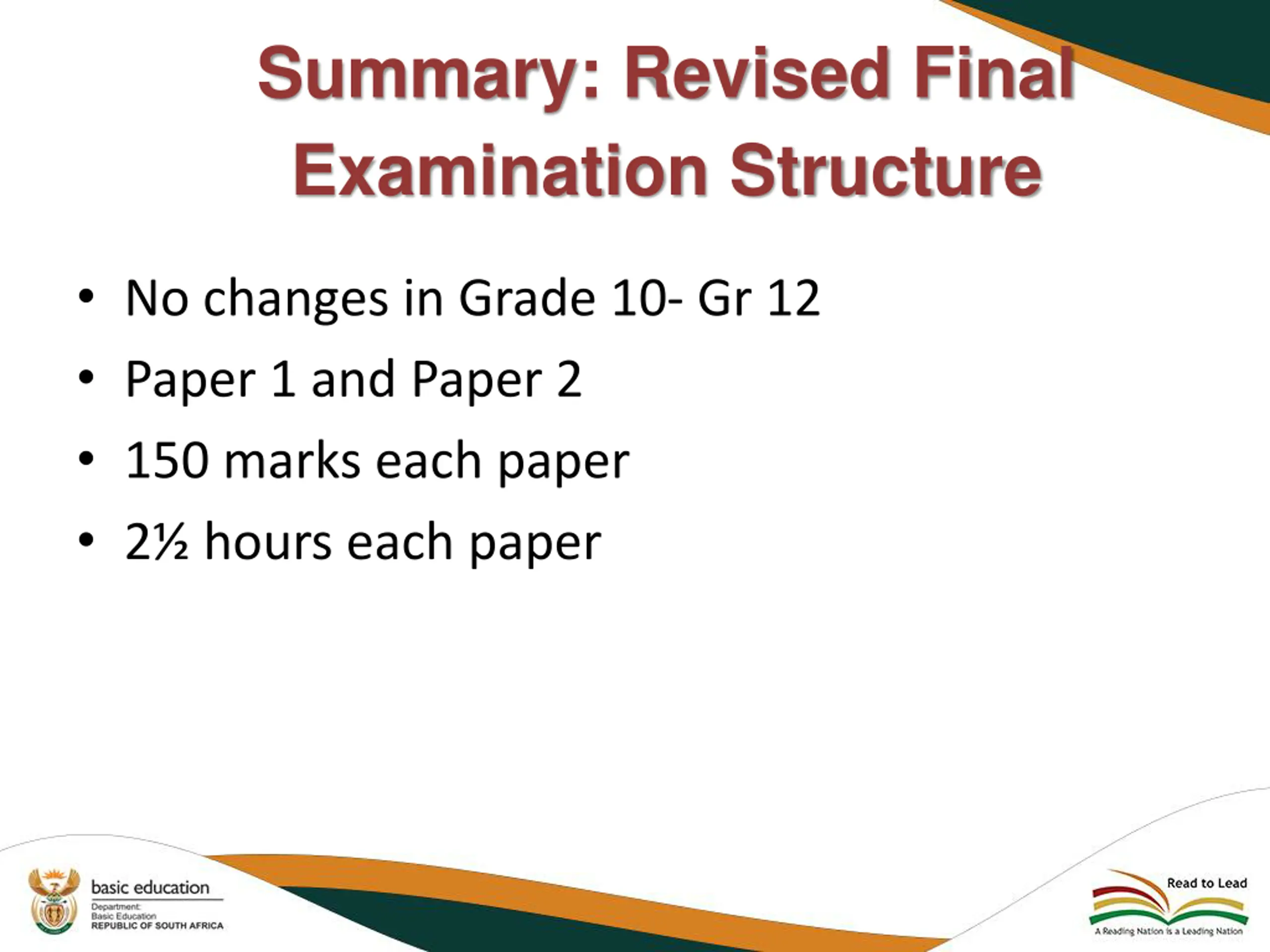 Summary: Revised Final Examination Structure No changes in Grade 10- Gr 12 Paper 1 and Paper 2 150 marks each paper 2 hours each paper