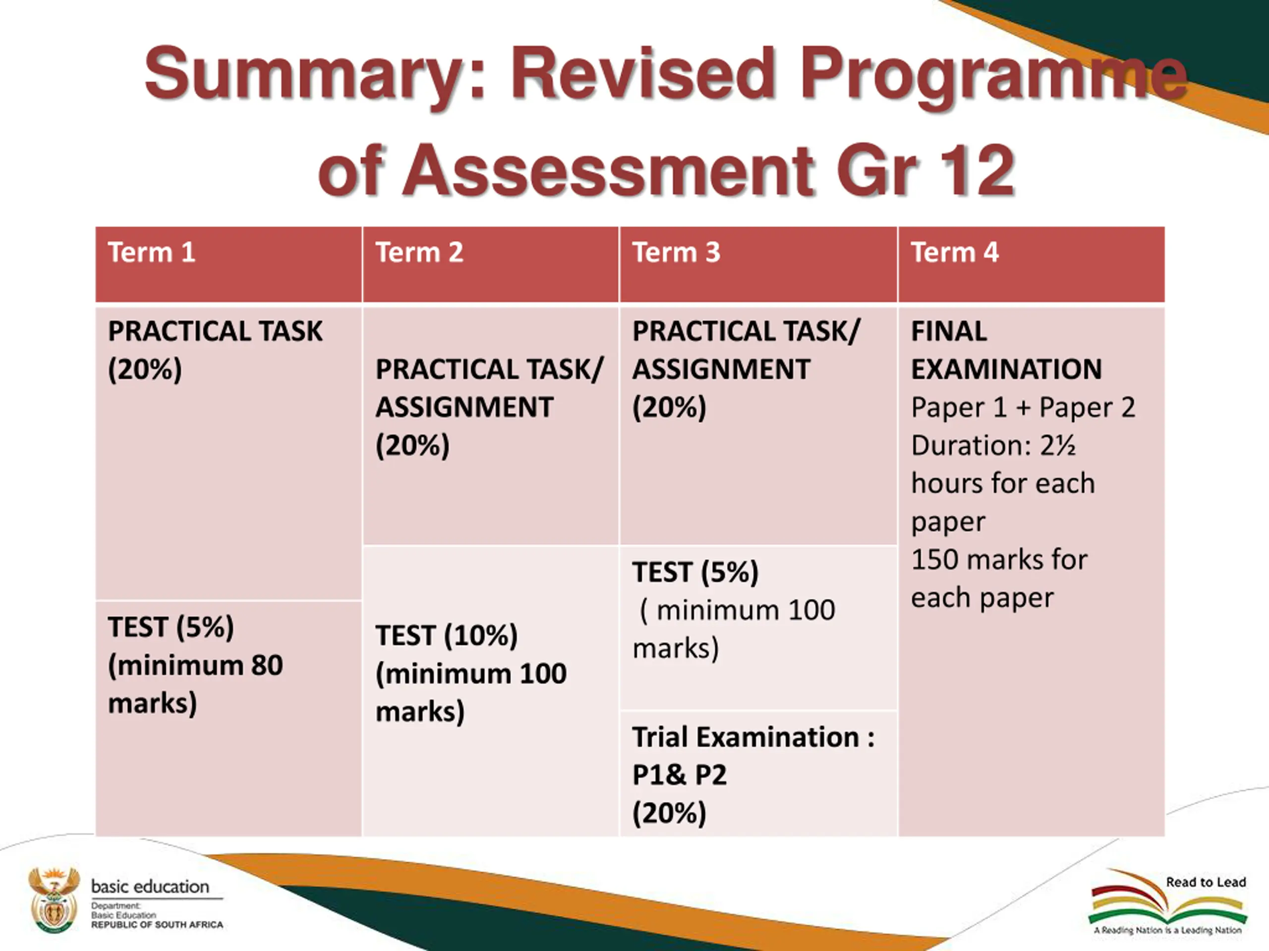 Summary: Revised Programme of Assessment Gr 12 Term 1 Term 2 Term 3 Term 4 PRACTICAL TASK (20%) PRACTICAL TASK/ ASSIGNMENT (20%) FINAL EXAMINATION Paper 1 + Paper 2 Duration: 2 hours for each paper 150 marks for each paper PRACTICAL TASK/ ASSIGNMENT (20%) TEST (5%) ( minimum 100 marks) TEST (5%) (minimum 80 marks) TEST (10%) (minimum 100 marks) Trial Examination : P1& P2 (20%)