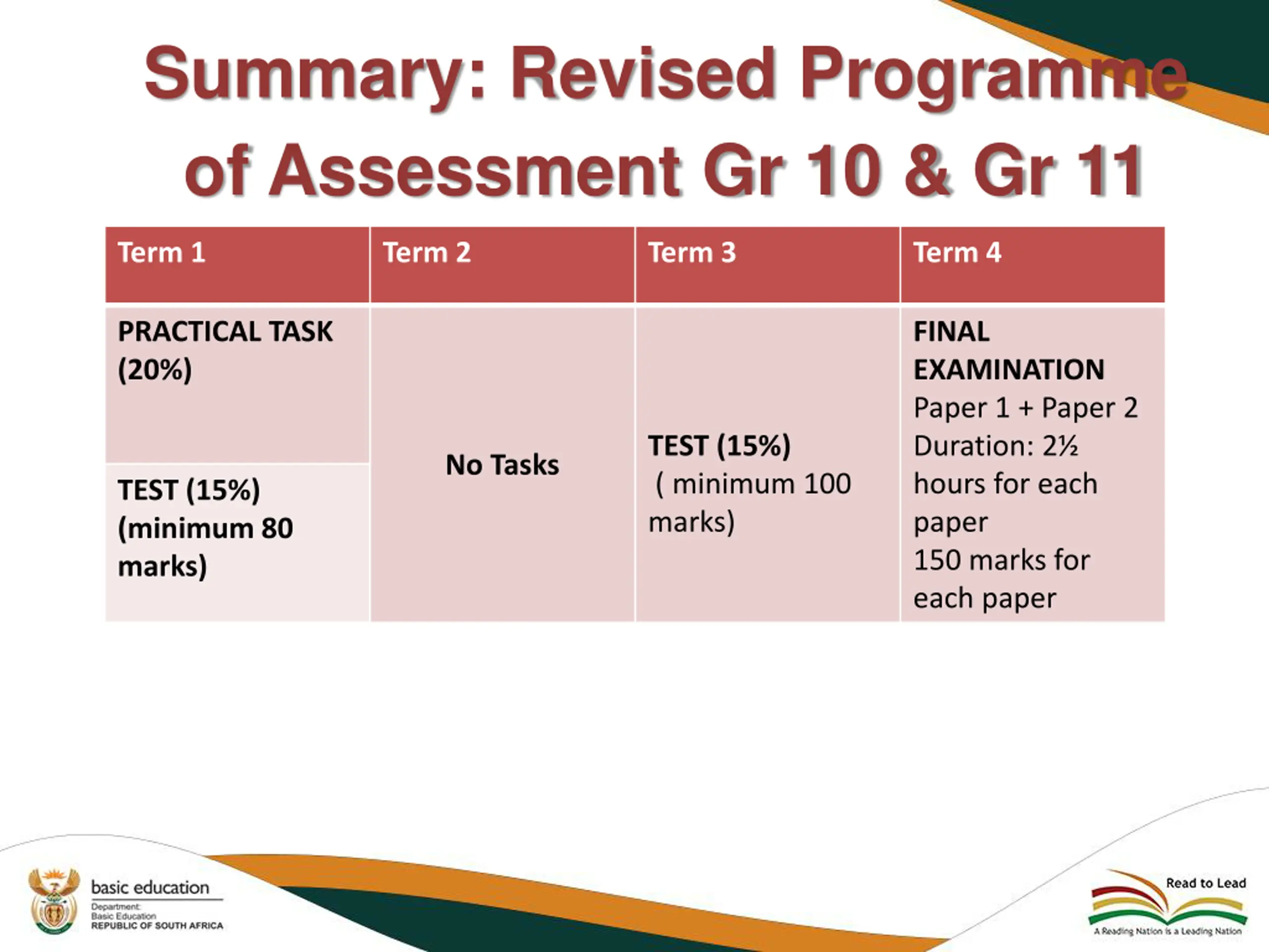 Summary: Revised Programme of Assessment Gr 10 & Gr 11 Term 1 Term 2 Term 3 Term 4 PRACTICAL TASK (20%) FINAL EXAMINATION Paper 1 + Paper 2 Duration: 2 hours for each paper 150 marks for each paper TEST (15%) ( minimum 100 marks) No Tasks TEST (15%) (minimum 80 marks)