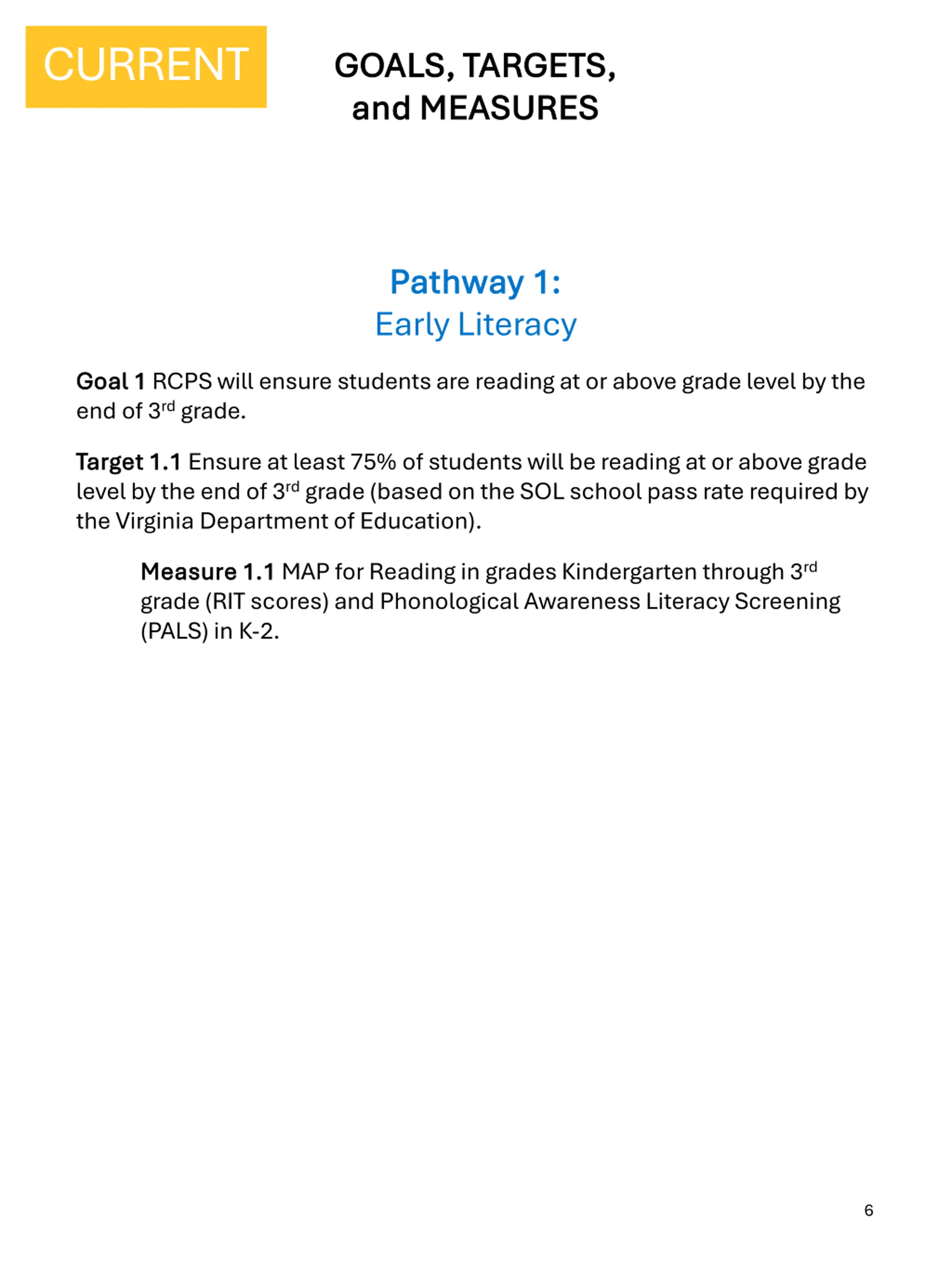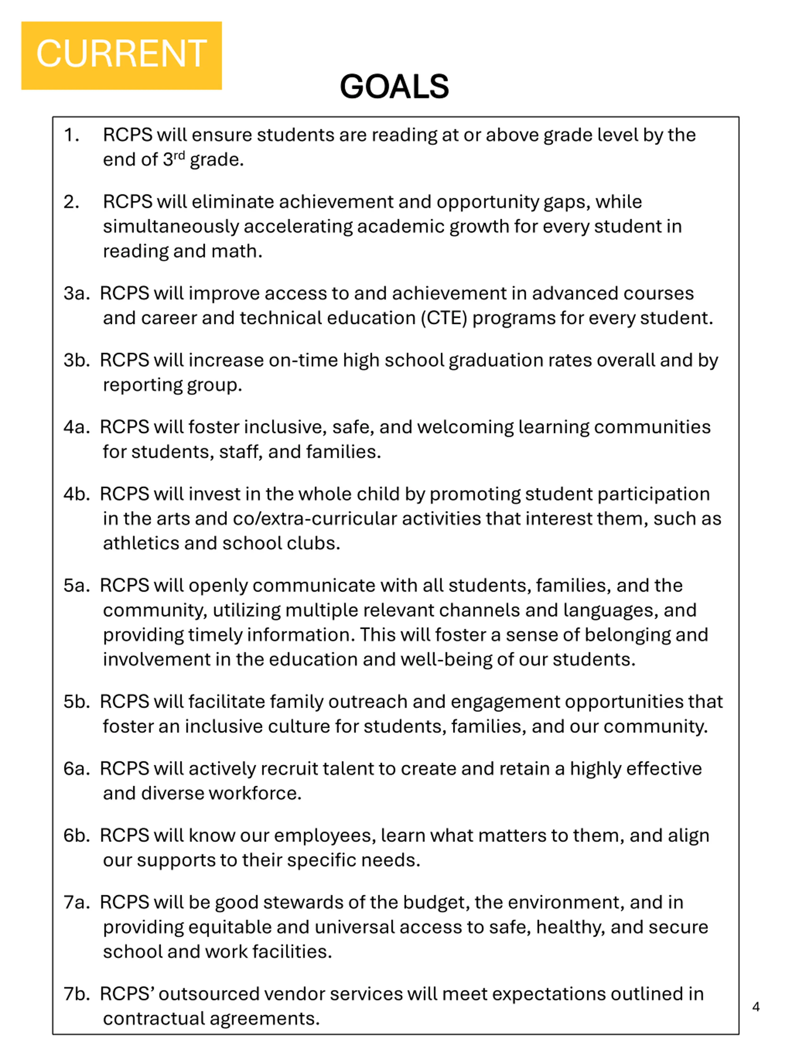 CURRENT GOALS GOALS 1. RCPS will ensure students are reading at or above grade level by the end of 3rd grade. 2. RCPS will eliminate achievement and opportunity gaps, while simultaneously accelerating academic growth for every student in reading and math. 3a. RCPS will improve access to and achievement in advanced courses and career and technical education (CTE) programs for every student. 3b. RCPS will increase on-time high school graduation rates overall and by reporting group. 4a. RCPS will foster inclusive, safe, and welcoming learning communities for students, staff, and families. 4b. RCPS will invest in the whole child by promoting student participation in the arts and co/extra-curricular activities that interest them, such as athletics and school clubs. 5a. RCPS will openly communicate with all students, families, and the community, utilizing multiple relevant channels and languages, and providing timely information. This will foster a sense of belonging and involvement in the education and well-being of our students. 5b. RCPS will facilitate family outreach and engagement opportunities that foster an inclusive culture for students, families, and our community. 6a. RCPS will actively recruit talent to create and retain a highly effective and diverse workforce. 6b. RCPS will know our employees, learn what matters to them, and align our supports to their specific needs. 7a. RCPS will be good stewards of the budget, the environment, and in providing equitable and universal access to safe, healthy, and secure school and work facilities. 7b. RCPS outsourced vendor services will meet expectations outlined in contractual agreements. 4