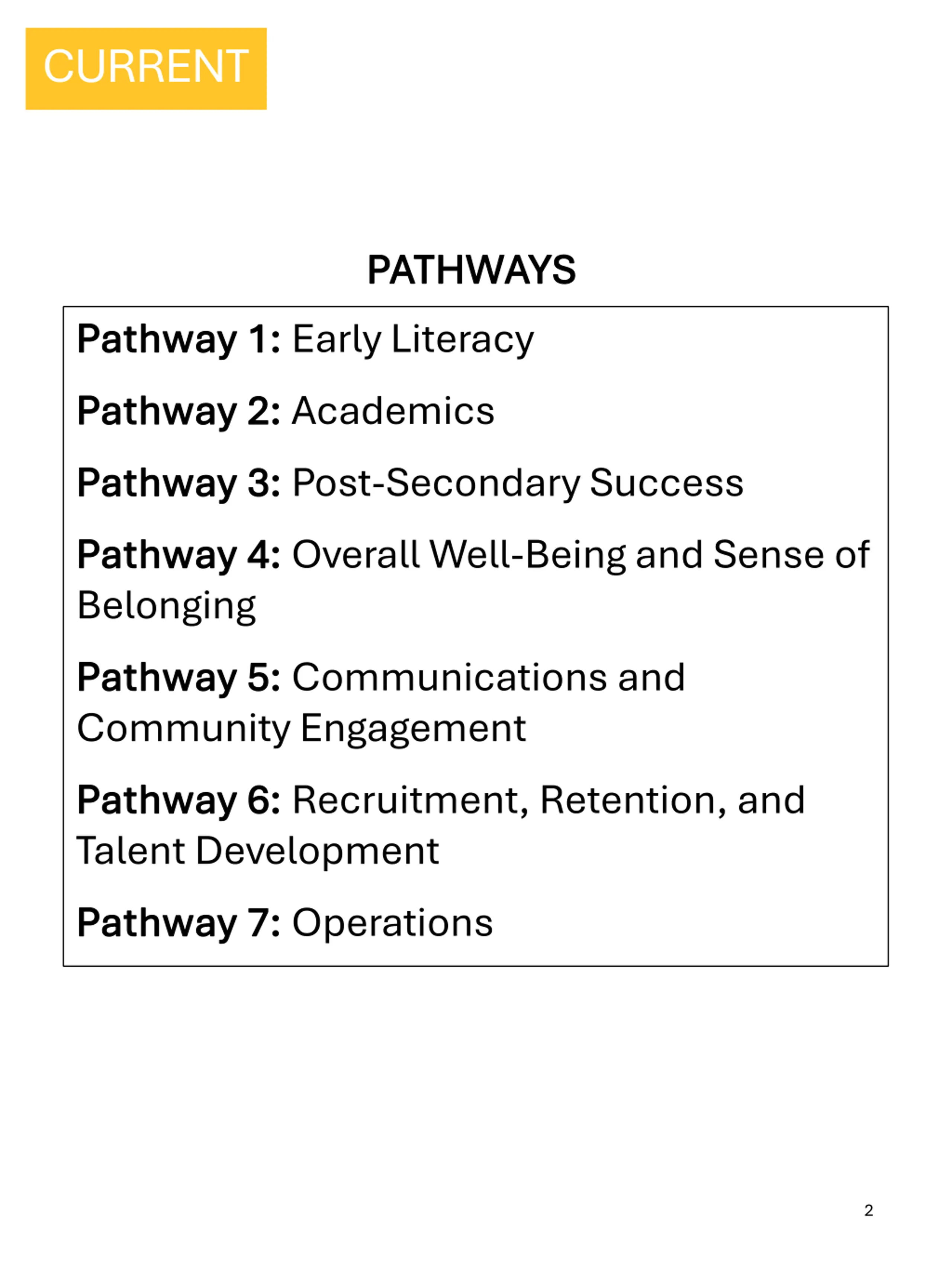 CURRENT PATHWAYS PATHWAYS Pathway 1: Pathway 1: Early Literacy Pathway 2: Pathway 2: Academics Pathway 3: Pathway 3: Post-Secondary Success Pathway 4: Pathway 4: Overall Well-Being and Sense of Belonging Pathway 5: Pathway 5: Communications and Community Engagement Pathway 6: Pathway 6: Recruitment, Retention, and Talent Development Pathway 7: Pathway 7: Operations 2