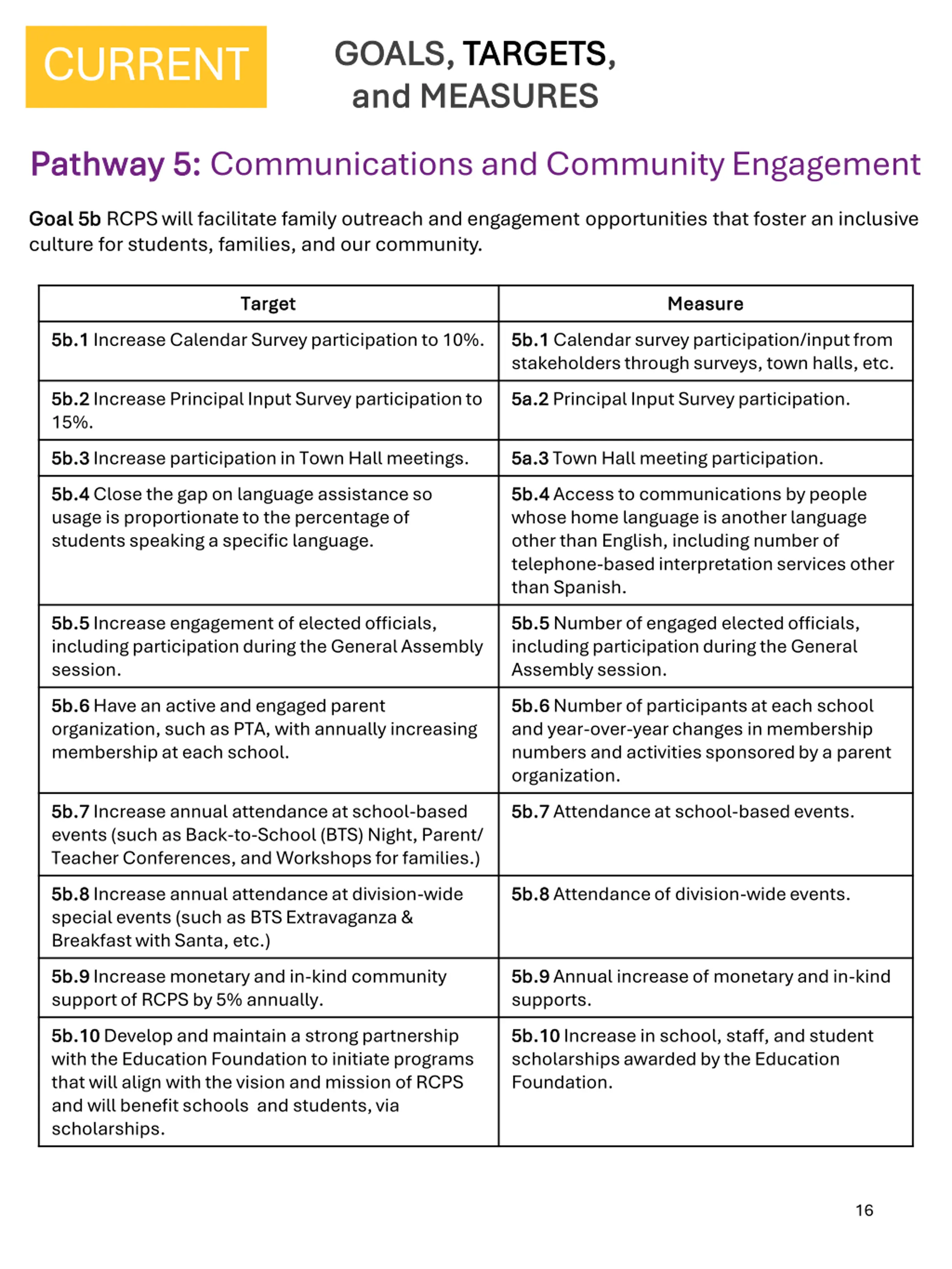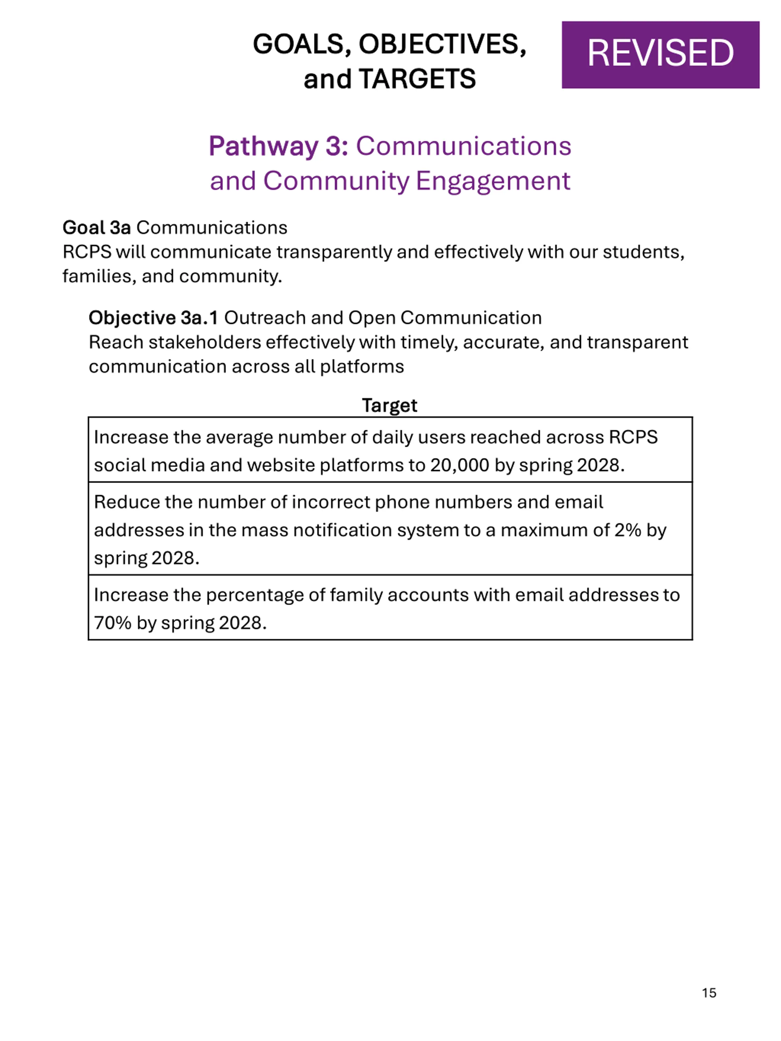 GOALS, OBJECTIVES, GOALS, OBJECTIVES, and TARGETS and TARGETS REVISED Pathway 3: Pathway 3: Communications and Community Engagement Goal 3a Goal 3a Communications RCPS will communicate transparently and effectively with our students, families, and community. Objective 3a.1 Objective 3a.1 Outreach and Open Communication Reach stakeholders effectively with timely, accurate, and transparent communication across all platforms Target Target Increase the average number of daily users reached across RCPS social media and website platforms to 20,000 by spring 2028. Reduce the number of incorrect phone numbers and email addresses in the mass notification system to a maximum of 2% by spring 2028. Increase the percentage of family accounts with email addresses to 70% by spring 2028. 15