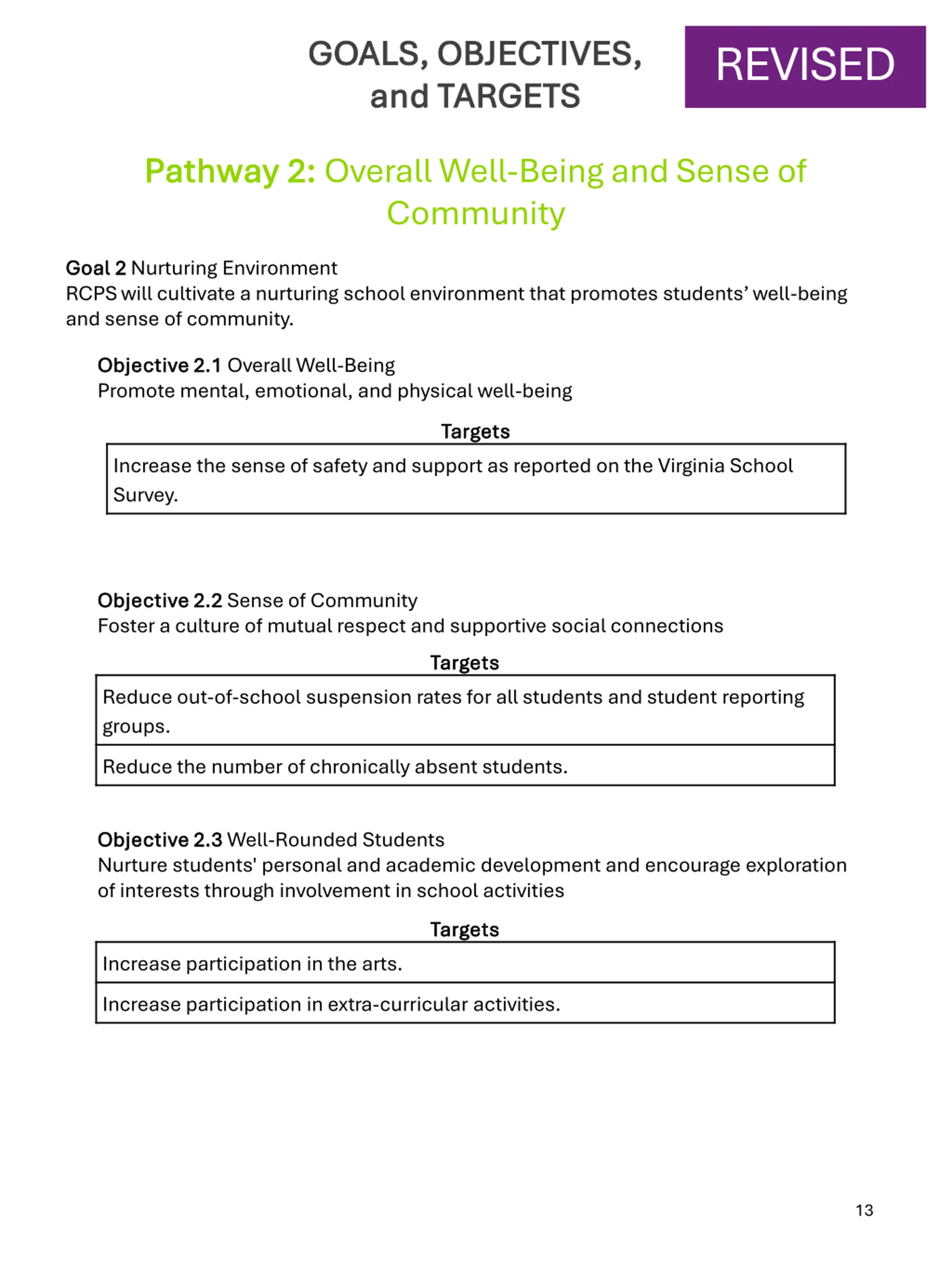 GOALS, OBJECTIVES, GOALS, OBJECTIVES, and TARGETS and TARGETS REVISED Pathway 2: Pathway 2: Overall Well-Being and Sense of Community Goal 2 Goal 2 Nurturing Environment RCPS will cultivate a nurturing school environment that promotes students well-being and sense of community. Objective 2.1 Objective 2.1 Overall Well-Being Promote mental, emotional, and physical well-being Targets Targets Increase the sense of safety and support as reported on the Virginia School Survey. Objective 2.2 Objective 2.2 Sense of Community Foster a culture of mutual respect and supportive social connections Targets Targets Reduce out-of-school suspension rates for all students and student reporting groups. Reduce the number of chronically absent students. Objective 2.3 Objective 2.3 Well-Rounded Students Nurture students' personal and academic development and encourage exploration of interests through involvement in school activities Targets Targets Increase participation in the arts. Increase participation in extra-curricular activities. 13