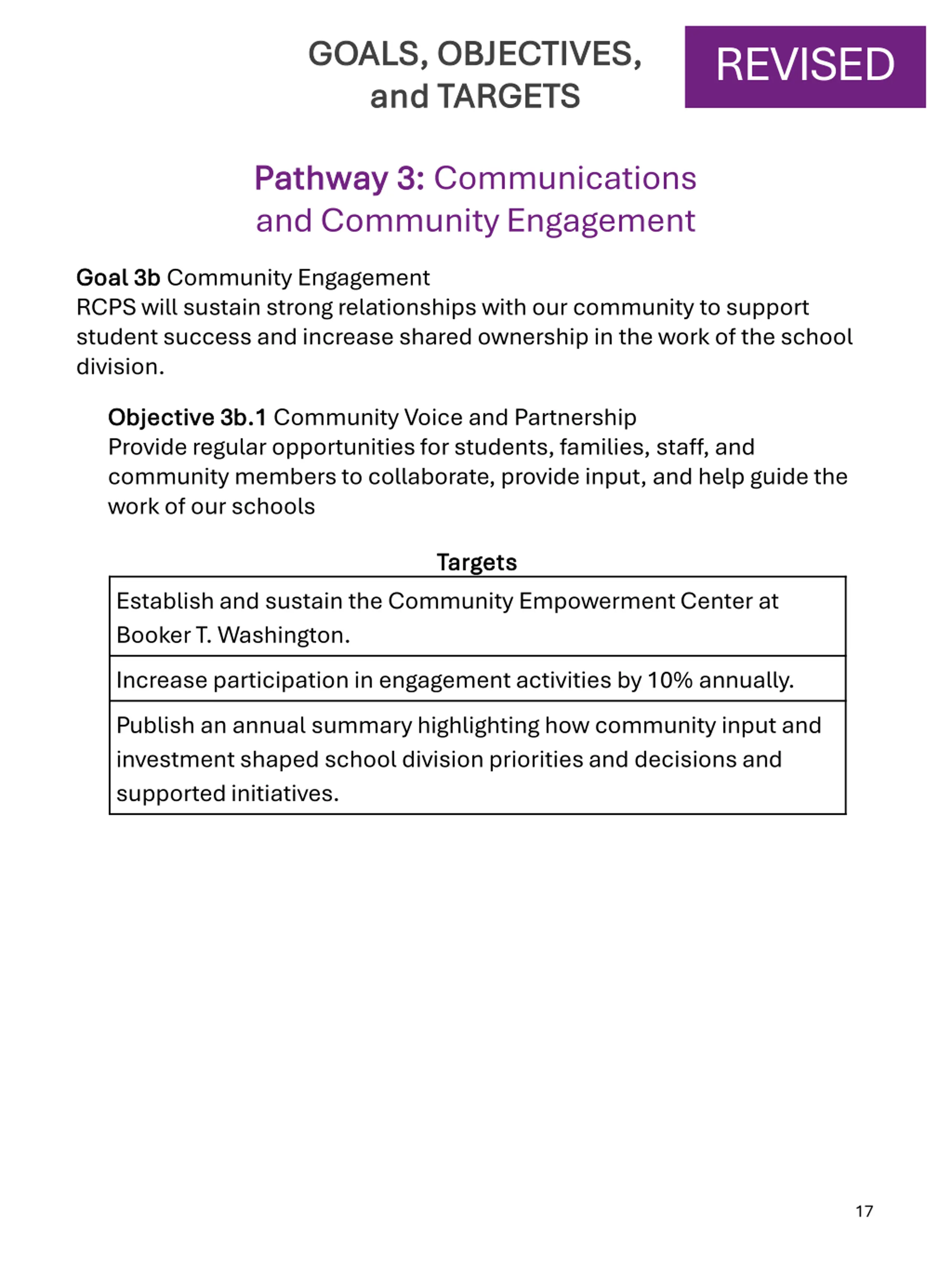 GOALS, OBJECTIVES, GOALS, OBJECTIVES, and TARGETS and TARGETS REVISED Pathway 3: Pathway 3: Communications and Community Engagement Goal 3b Goal 3b Community Engagement RCPS will sustain strong relationships with our community to support student success and increase shared ownership in the work of the school division. Objective 3b.1 Objective 3b.1 Community Voice and Partnership Provide regular opportunities for students, families, staff, and community members to collaborate, provide input, and help guide the work of our schools Targets Targets Establish and sustain the Community Empowerment Center at Booker T. Washington. Increase participation in engagement activities by 10% annually. Publish an annual summary highlighting how community input and investment shaped school division priorities and decisions and supported initiatives. 17
