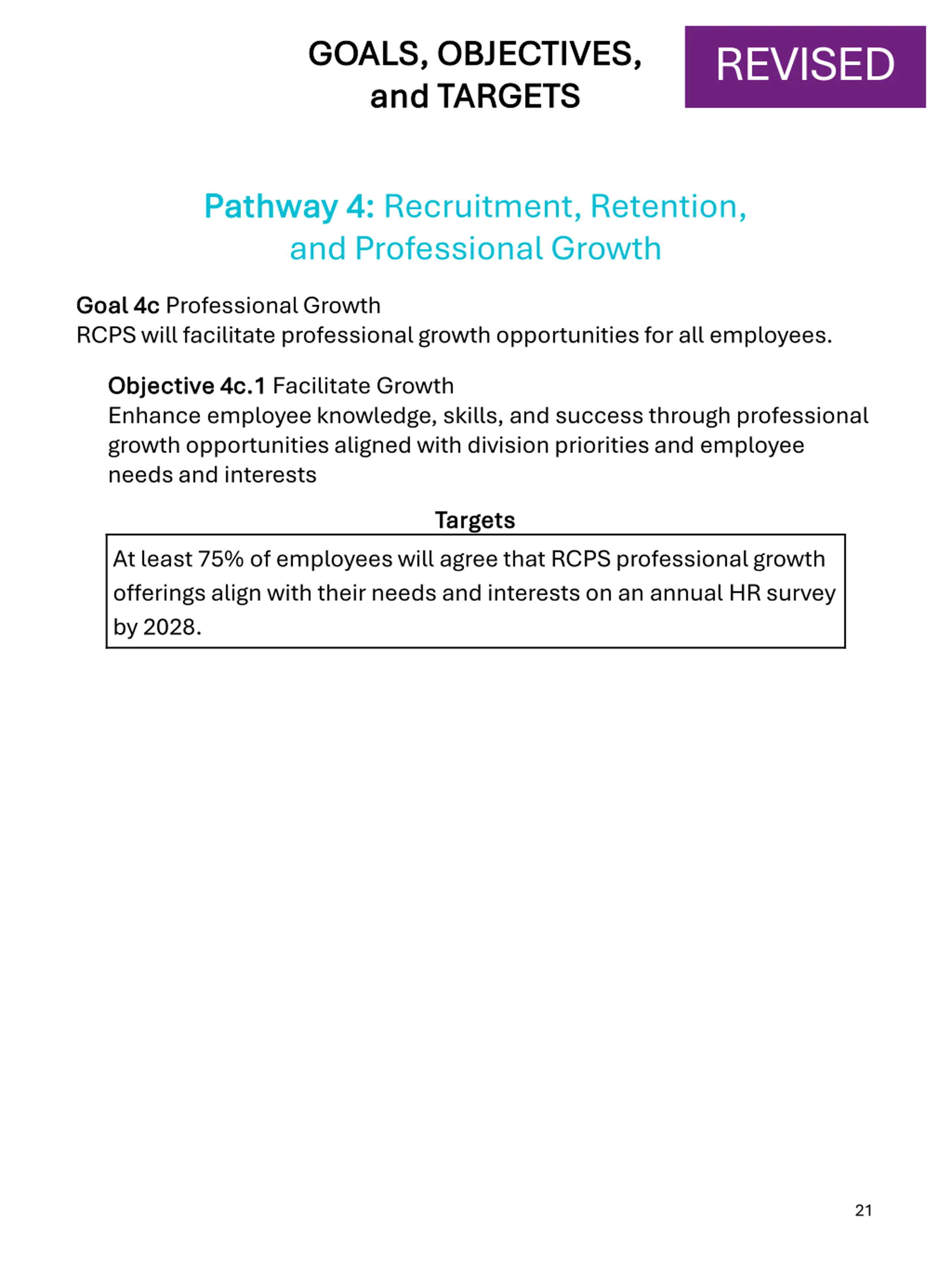 GOALS, OBJECTIVES, GOALS, OBJECTIVES, and TARGETS and TARGETS REVISED Pathway 4: Pathway 4: Recruitment, Retention, and Professional Growth Goal 4c Goal 4c Professional Growth RCPS will facilitate professional growth opportunities for all employees. Objective 4c.1 Objective 4c.1 Facilitate Growth Enhance employee knowledge, skills, and success through professional growth opportunities aligned with division priorities and employee needs and interests Targets Targets At least 75% of employees will agree that RCPS professional growth offerings align with their needs and interests on an annual HR survey by 2028. 21