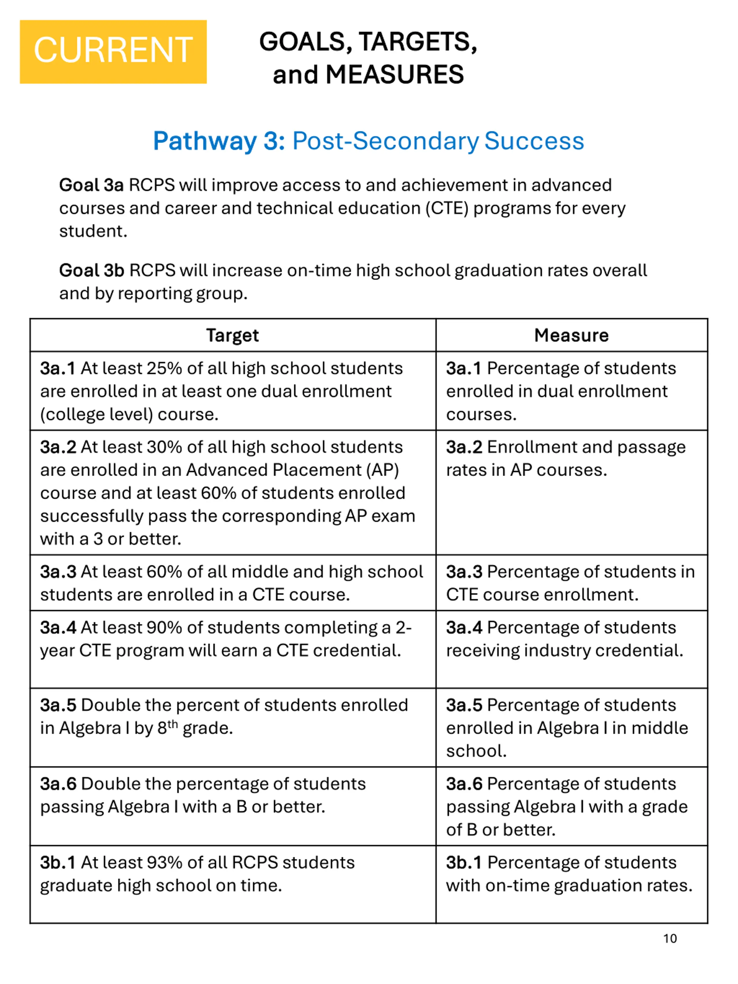 GOALS, TARGETS, GOALS, TARGETS, and MEASURES and MEASURES CURRENT Pathway 3: Pathway 3: Post-Secondary Success Goal 3a Goal 3a RCPS will improve access to and achievement in advanced courses and career and technical education (CTE) programs for every student. Goal 3b Goal 3b RCPS will increase on-time high school graduation rates overall and by reporting group. Target Target Measure Measure 3a.1 3a.1 At least 25% of all high school students are enrolled in at least one dual enrollment (college level) course. 3a.2 3a.2 At least 30% of all high school students are enrolled in an Advanced Placement (AP) course and at least 60% of students enrolled successfully pass the corresponding AP exam with a 3 or better. 3a.3 3a.3 At least 60% of all middle and high school students are enrolled in a CTE course. 3a.4 3a.4 At least 90% of students completing a 2- year CTE program will earn a CTE credential. 3a.1 3a.1 Percentage of students enrolled in dual enrollment courses. 3a.2 3a.2 Enrollment and passage rates in AP courses. 3a.3 3a.3 Percentage of students in CTE course enrollment. 3a.4 3a.4 Percentage of students receiving industry credential. 3a.5 3a.5 Double the percent of students enrolled in Algebra I by 8th grade. 3a.5 3a.5 Percentage of students enrolled in Algebra I in middle school. 3a.6 3a.6 Percentage of students passing Algebra I with a grade of B or better. 3b.1 3b.1 Percentage of students with on-time graduation rates. 3a.6 3a.6 Double the percentage of students passing Algebra I with a B or better. 3b.1 3b.1 At least 93% of all RCPS students graduate high school on time. 10
