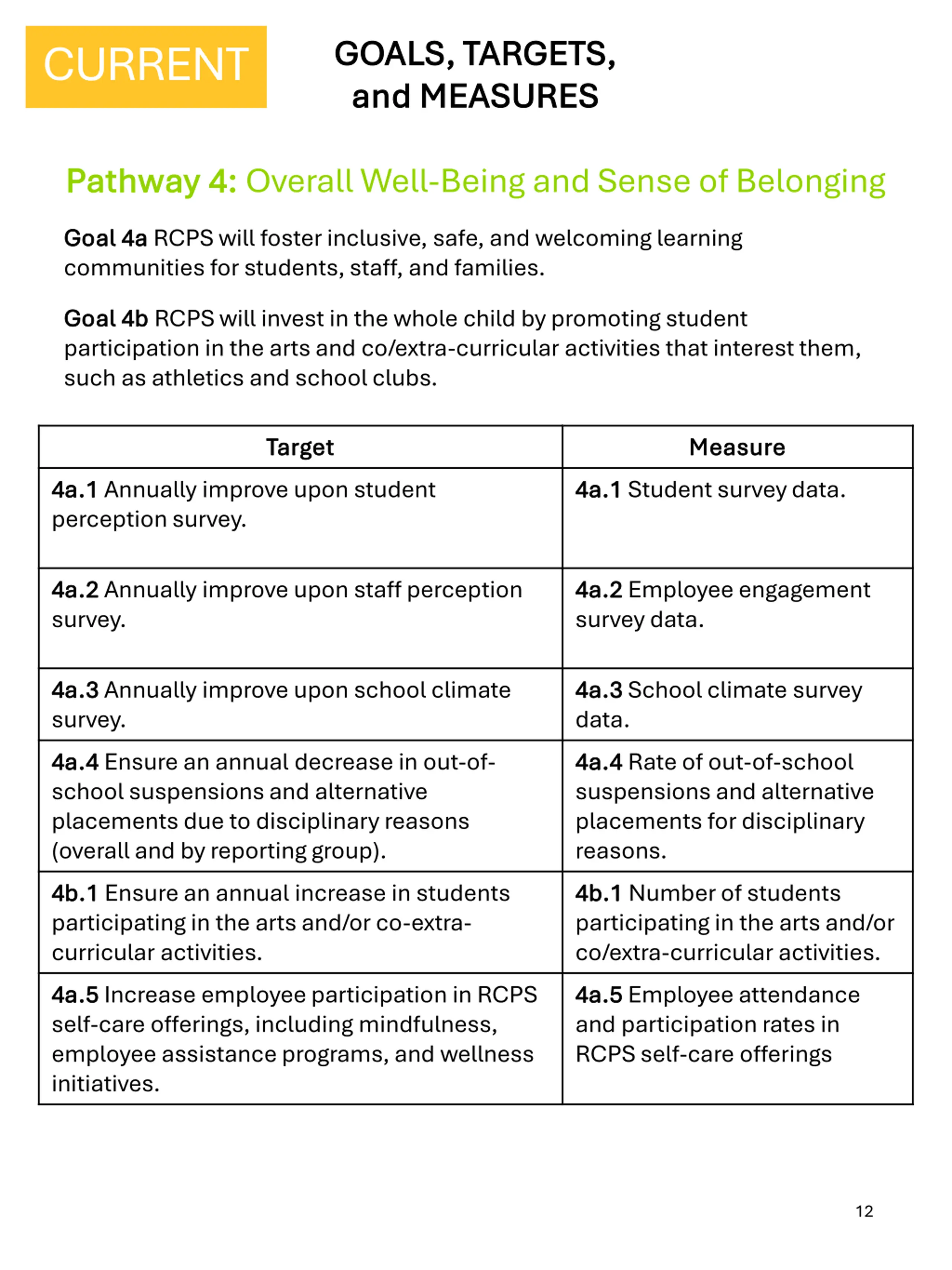 GOALS, TARGETS, GOALS, TARGETS, and MEASURES and MEASURES CURRENT Pathway 4: Pathway 4: Overall Well-Being and Sense of Belonging Goal 4a Goal 4a RCPS will foster inclusive, safe, and welcoming learning communities for students, staff, and families. Goal 4b Goal 4b RCPS will invest in the whole child by promoting student participation in the arts and co/extra-curricular activities that interest them, such as athletics and school clubs. Target Target Measure Measure 4a.1 4a.1 Annually improve upon student perception survey. 4a.1 4a.1 Student survey data. 4a.2 4a.2 Annually improve upon staff perception survey. 4a.2 4a.2 Employee engagement survey data. 4a.3 4a.3 Annually improve upon school climate survey. 4a.4 4a.4 Ensure an annual decrease in out-of- school suspensions and alternative placements due to disciplinary reasons (overall and by reporting group). 4b.1 4b.1 Ensure an annual increase in students participating in the arts and/or co-extra- curricular activities. 4a.5 4a.5 Increase employee participation in RCPS self-care offerings, including mindfulness, employee assistance programs, and wellness initiatives. 4a.3 4a.3 School climate survey data. 4a.4 4a.4 Rate of out-of-school suspensions and alternative placements for disciplinary reasons. 4b.1 4b.1 Number of students participating in the arts and/or co/extra-curricular activities. 4a.5 4a.5 Employee attendance and participation rates in RCPS self-care offerings 12