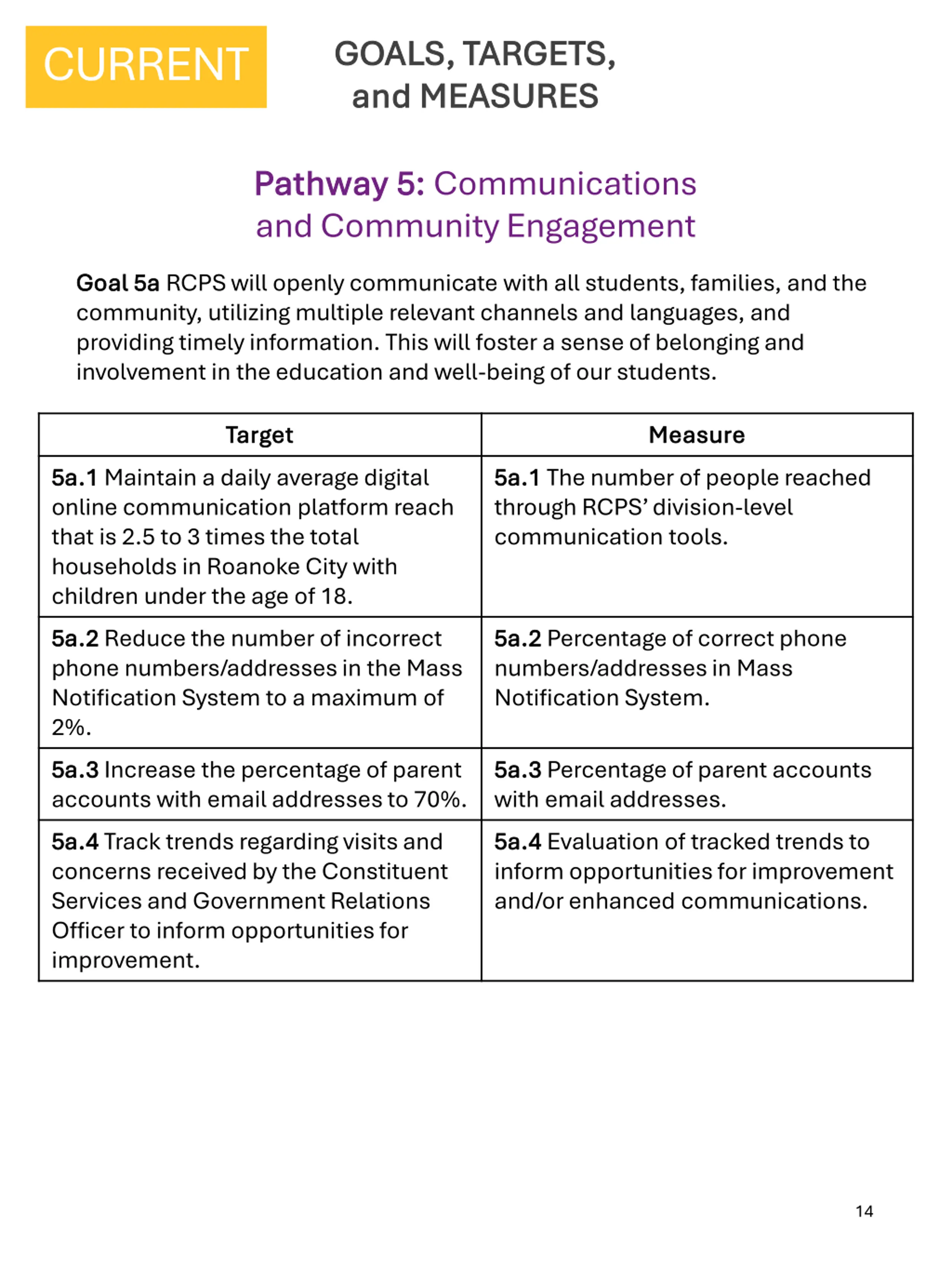 GOALS, TARGETS, GOALS, TARGETS, and MEASURES and MEASURES CURRENT Pathway 5: Pathway 5: Communications and Community Engagement Goal 5a Goal 5a RCPS will openly communicate with all students, families, and the community, utilizing multiple relevant channels and languages, and providing timely information. This will foster a sense of belonging and involvement in the education and well-being of our students. Target Target Measure Measure 5a.1 5a.1 Maintain a daily average digital online communication platform reach that is 2.5 to 3 times the total households in Roanoke City with children under the age of 18. 5a.2 5a.2 Reduce the number of incorrect phone numbers/addresses in the Mass Notification System to a maximum of 2%. 5a.3 5a.3 Increase the percentage of parent accounts with email addresses to 70%. 5a.4 5a.4 Track trends regarding visits and concerns received by the Constituent Services and Government Relations Officer to inform opportunities for improvement. 5a.1 5a.1 The number of people reached through RCPS division-level communication tools. 5a.2 5a.2 Percentage of correct phone numbers/addresses in Mass Notification System. 5a.3 5a.3 Percentage of parent accounts with email addresses. 5a.4 5a.4 Evaluation of tracked trends to inform opportunities for improvement and/or enhanced communications. 14