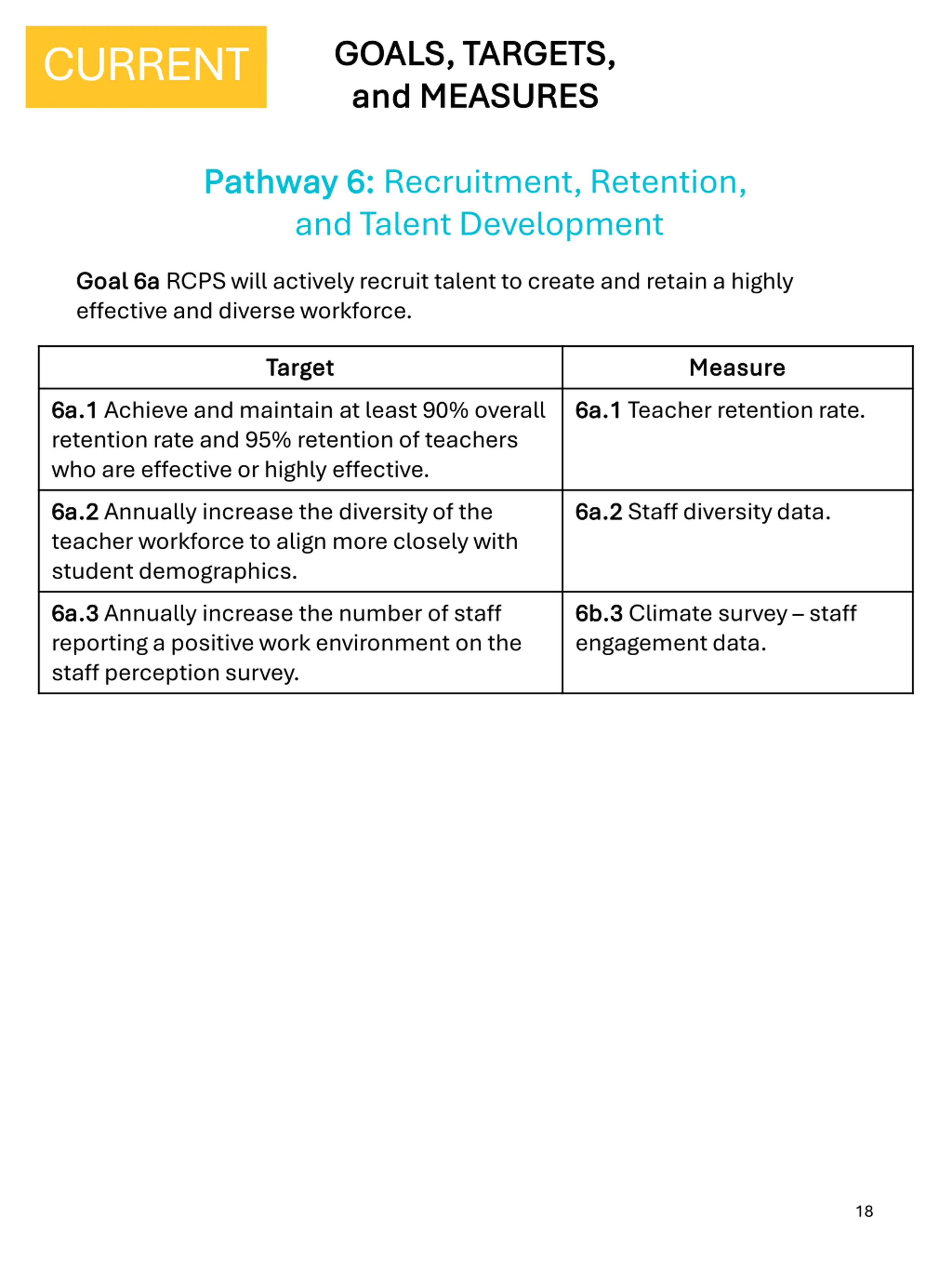GOALS, TARGETS, GOALS, TARGETS, and MEASURES and MEASURES CURRENT Pathway 6: Pathway 6: Recruitment, Retention, and Talent Development Goal 6a Goal 6a RCPS will actively recruit talent to create and retain a highly effective and diverse workforce. Target Target Measure Measure 6a.1 6a.1 Achieve and maintain at least 90% overall retention rate and 95% retention of teachers who are effective or highly effective. 6a.2 6a.2 Annually increase the diversity of the teacher workforce to align more closely with student demographics. 6a.3 6a.3 Annually increase the number of staff reporting a positive work environment on the staff perception survey. 6a.1 6a.1 Teacher retention rate. 6a.2 6a.2 Staff diversity data. 6b.3 6b.3 Climate survey staff engagement data. 18