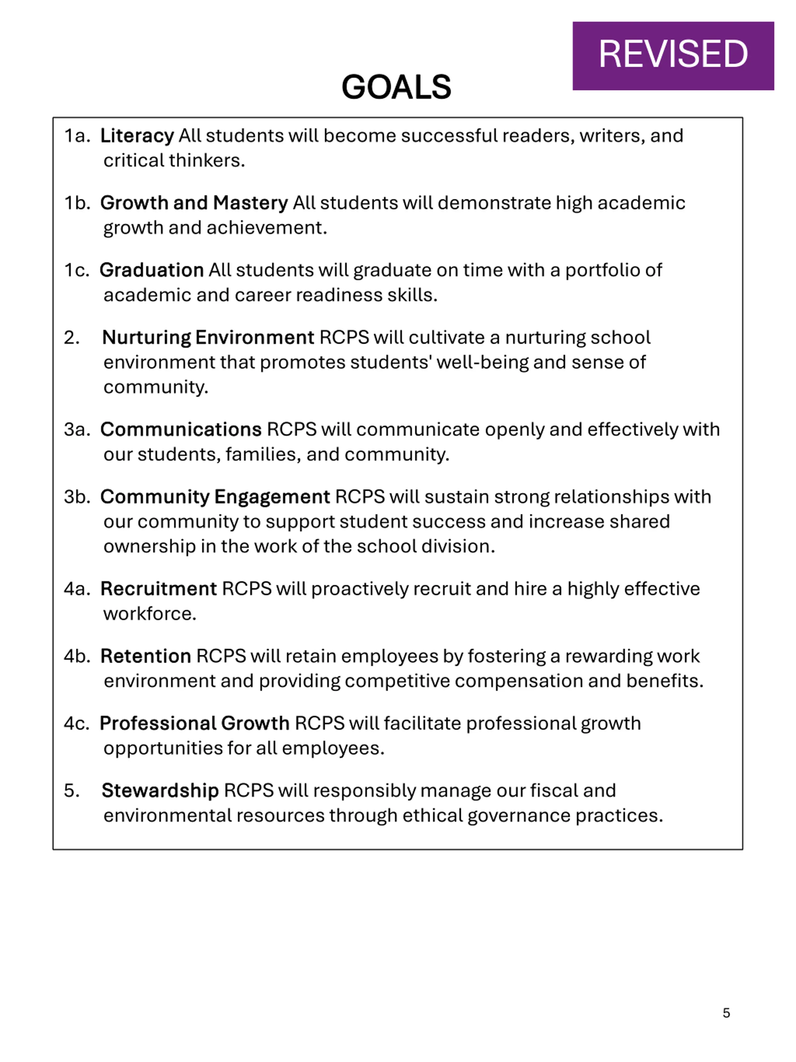 REVISED GOALS GOALS 1a. Literacy Literacy All students will become successful readers, writers, and critical thinkers. 1b. Growth and Mastery Growth and Mastery All students will demonstrate high academic growth and achievement. 1c. Graduation Graduation All students will graduate on time with a portfolio of academic and career readiness skills. 2. Nurturing Environment Nurturing Environment RCPS will cultivate a nurturing school environment that promotes students' well-being and sense of community. 3a. Communications Communications RCPS will communicate openly and effectively with our students, families, and community. 3b. Community Engagement Community Engagement RCPS will sustain strong relationships with our community to support student success and increase shared ownership in the work of the school division. 4a. Recruitment Recruitment RCPS will proactively recruit and hire a highly effective workforce. 4b. Retention Retention RCPS will retain employees by fostering a rewarding work environment and providing competitive compensation and benefits. 4c. Professional Growth Professional Growth RCPS will facilitate professional growth opportunities for all employees. 5. Stewardship Stewardship RCPS will responsibly manage our fiscal and environmental resources through ethical governance practices. 5