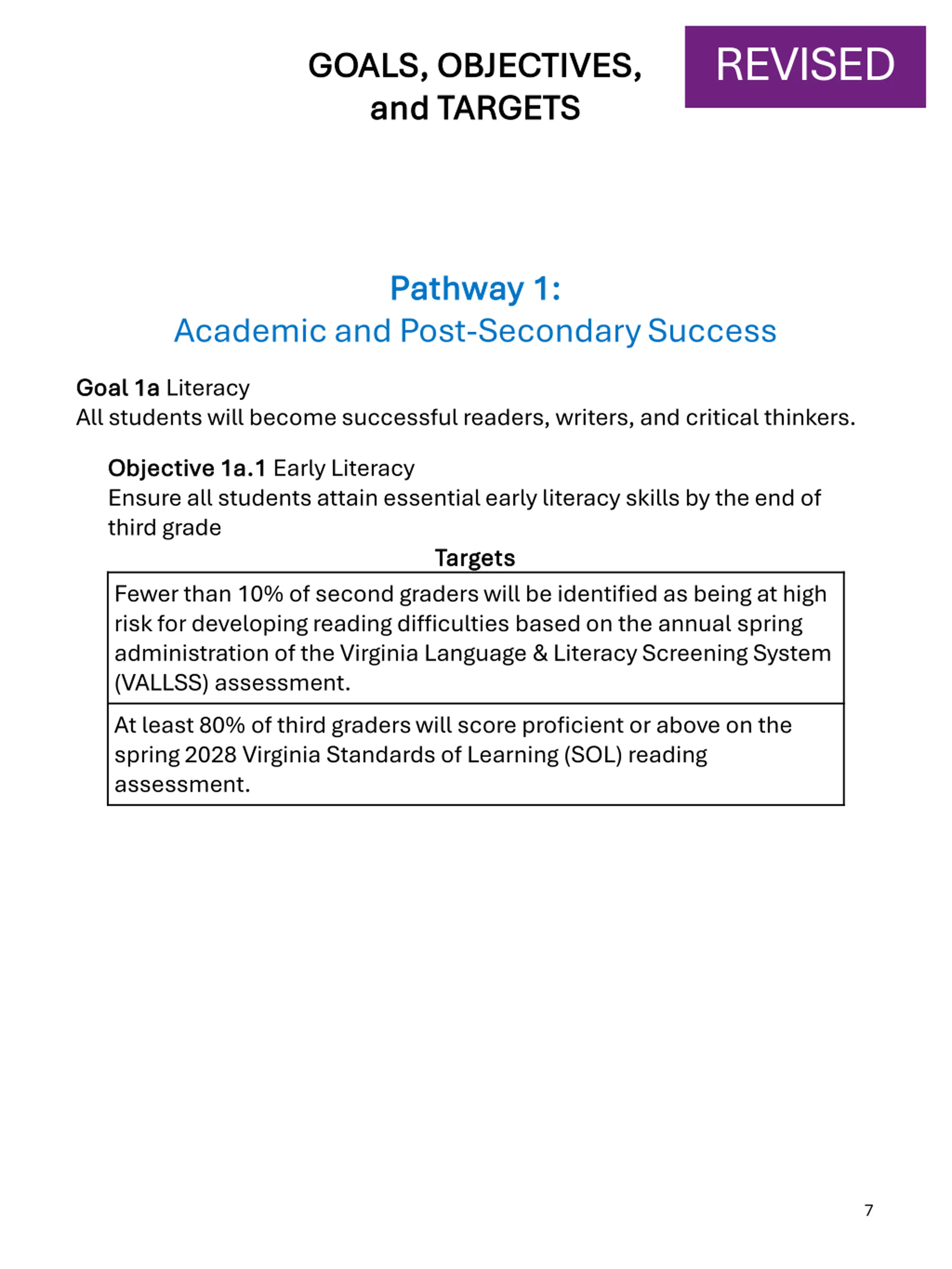 REVISED GOALS, OBJECTIVES, GOALS, OBJECTIVES, and TARGETS and TARGETS Pathway 1: Pathway 1: Academic and Post-Secondary Success Goal 1a Goal 1a Literacy All students will become successful readers, writers, and critical thinkers. Objective 1a.1 Objective 1a.1 Early Literacy Ensure all students attain essential early literacy skills by the end of third grade Targets Targets Fewer than 10% of second graders will be identified as being at high risk for developing reading difficulties based on the annual spring administration of the Virginia Language & Literacy Screening System (VALLSS) assessment. At least 80% of third graders will score proficient or above on the spring 2028 Virginia Standards of Learning (SOL) reading assessment. 7