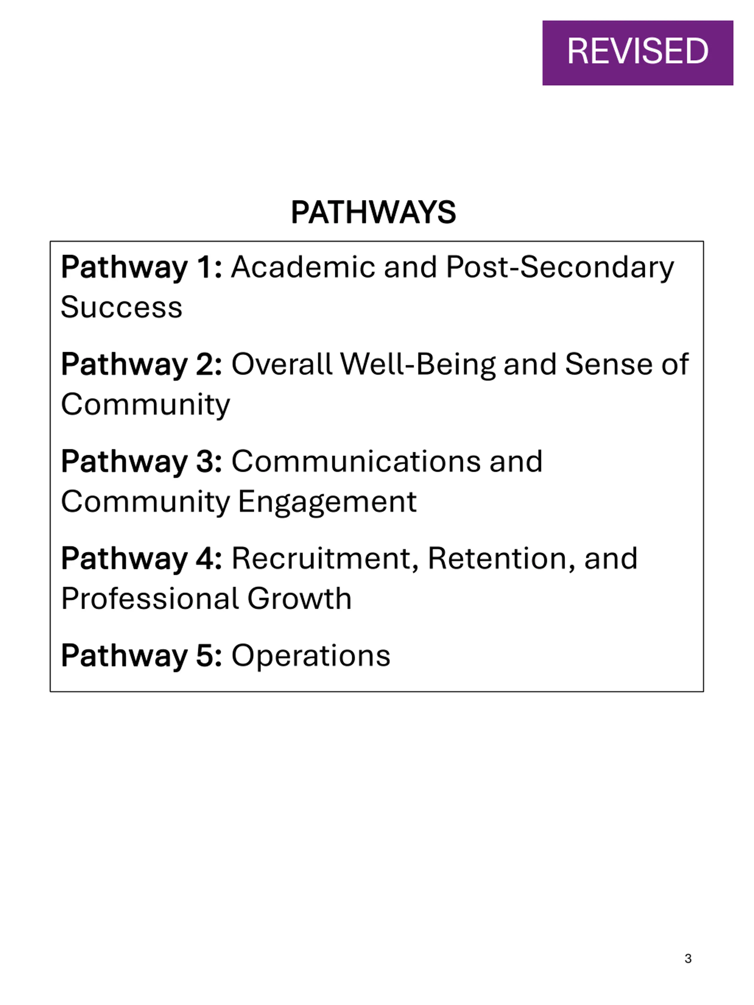 REVISED PATHWAYS PATHWAYS Pathway 1: Pathway 1: Academic and Post-Secondary Success Pathway 2: Pathway 2: Overall Well-Being and Sense of Community Pathway 3: Pathway 3: Communications and Community Engagement Pathway 4: Pathway 4: Recruitment, Retention, and Professional Growth Pathway 5: Pathway 5: Operations 3