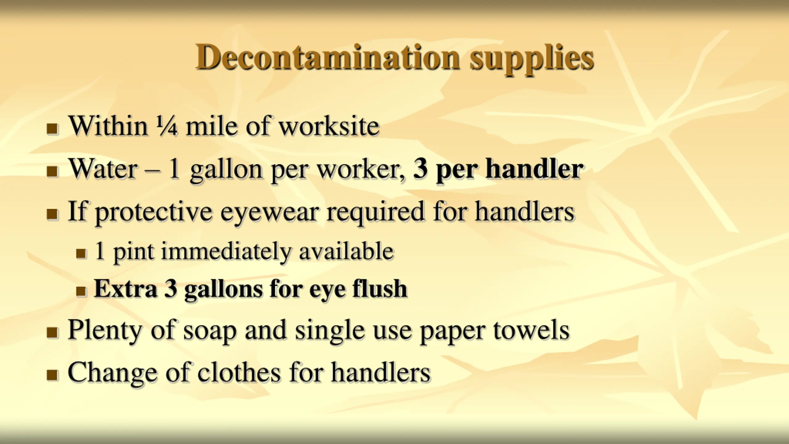 Decontamination supplies Within mile of worksite Water 1 gallon per worker, 3 per handler If protective eyewear required for handlers 1 pint immediately available Extra 3 gallons for eye flush Plenty of soap and single use paper towels Change of clothes for handlers