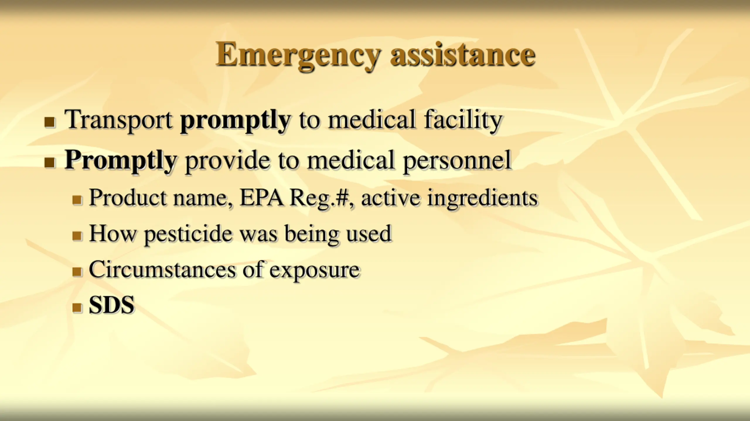 Emergency assistance Transport promptly to medical facility Promptly provide to medical personnel Product name, EPA Reg.#, active ingredients How pesticide was being used Circumstances of exposure SDS