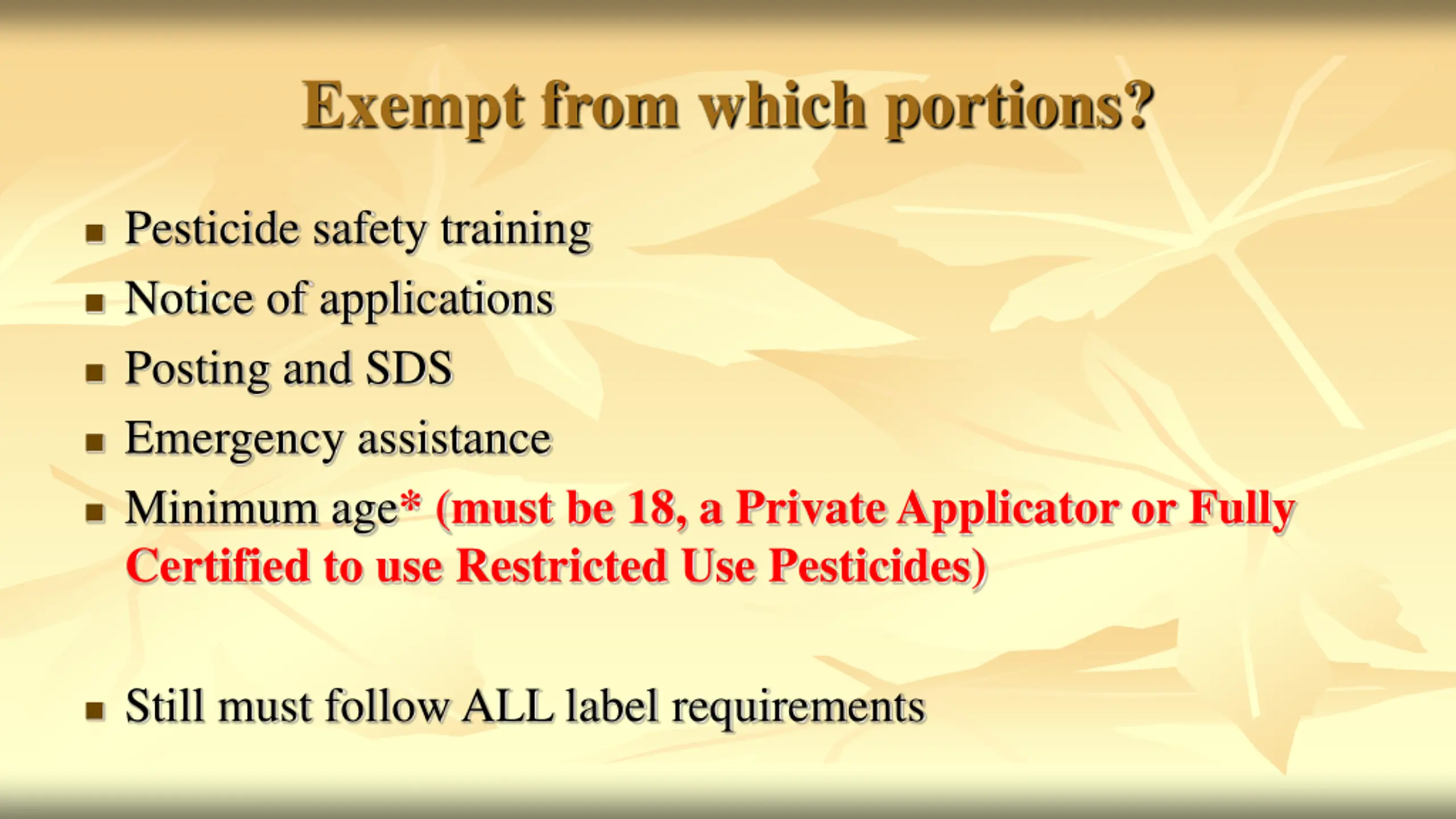 Exempt from which portions? Pesticide safety training Notice of applications Posting and SDS Emergency assistance Minimum age* (must be 18, a Private Applicator or Fully Certified to use Restricted Use Pesticides) Still must follow ALL label requirements