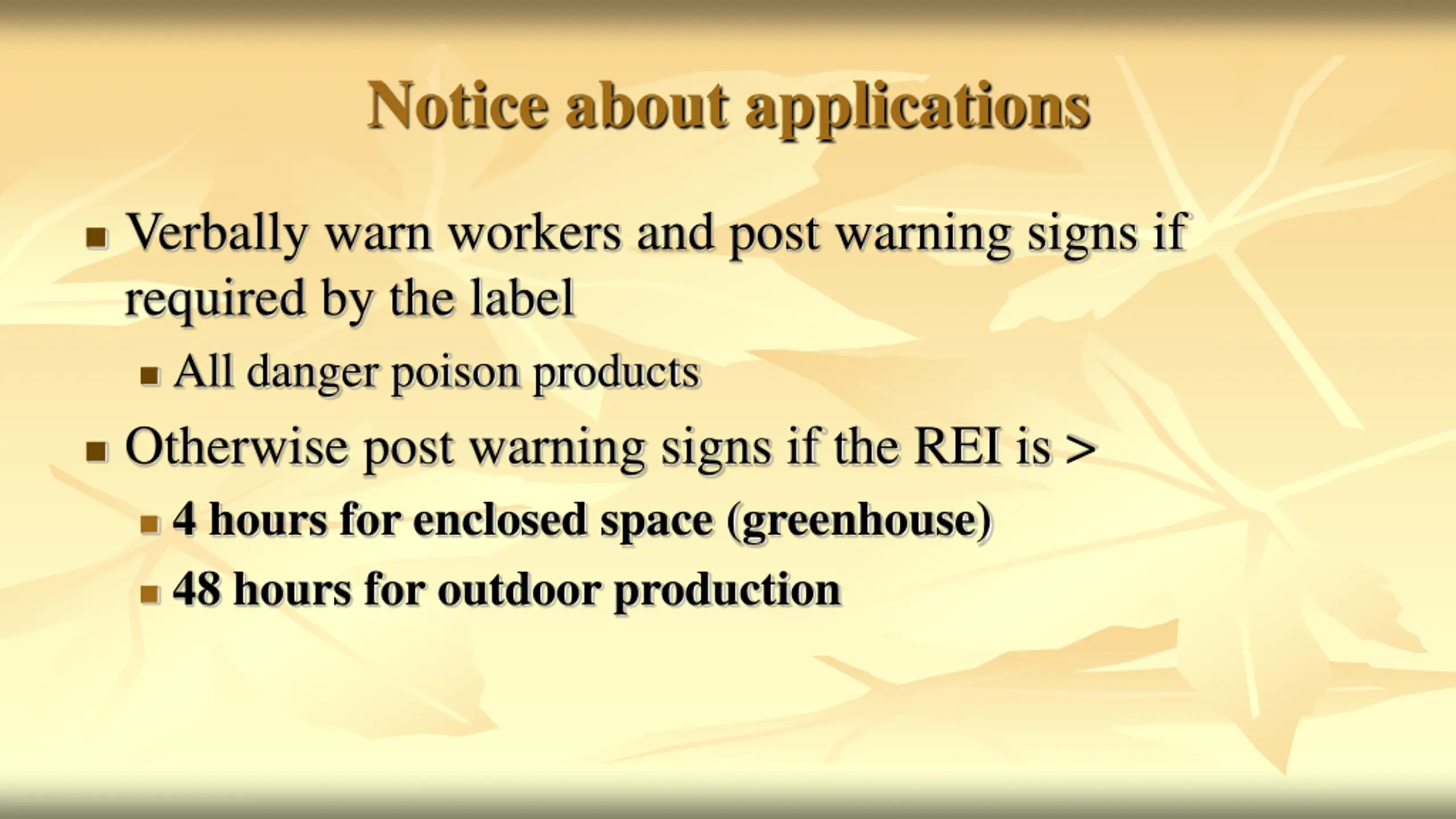 Notice about applications Verbally warn workers and post warning signs if required by the label All danger poison products Otherwise post warning signs if the REI is > 4 hours for enclosed space (greenhouse) 48 hours for outdoor production