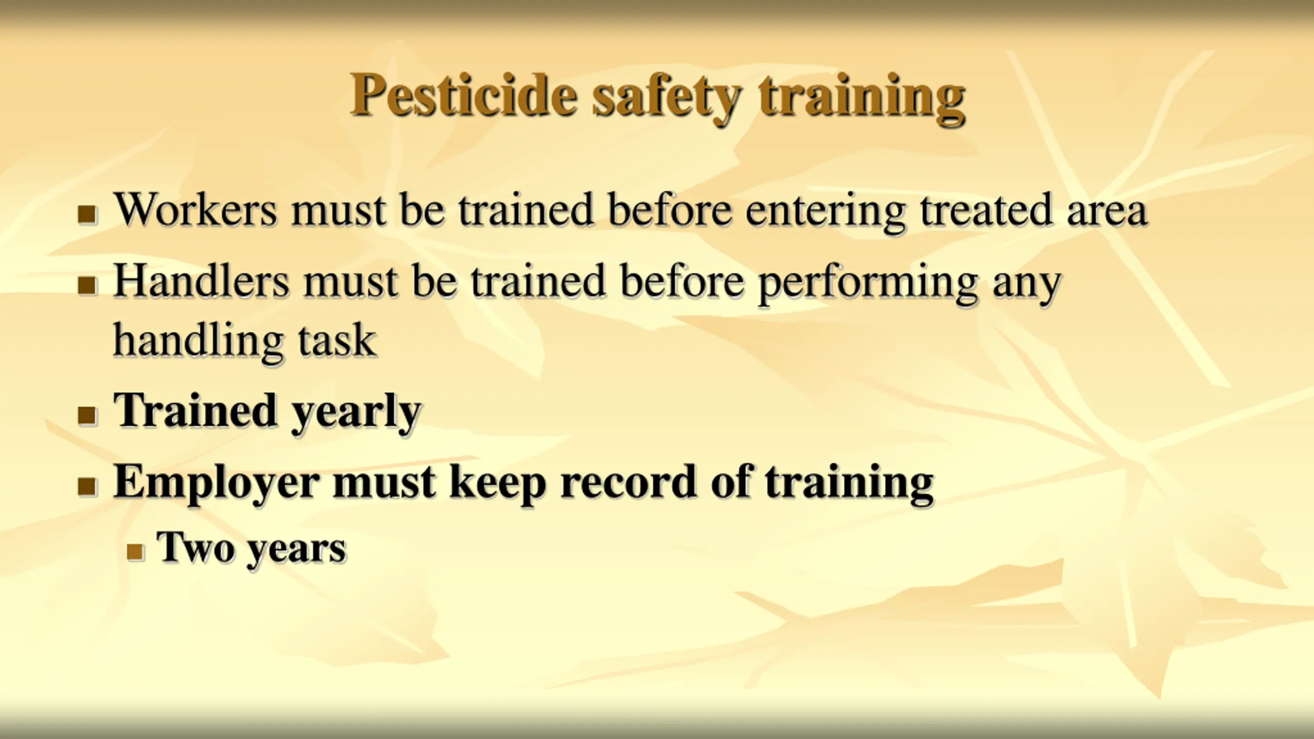 Pesticide safety training Workers must be trained before entering treated area Handlers must be trained before performing any handling task Trained yearly Employer must keep record of training Two years