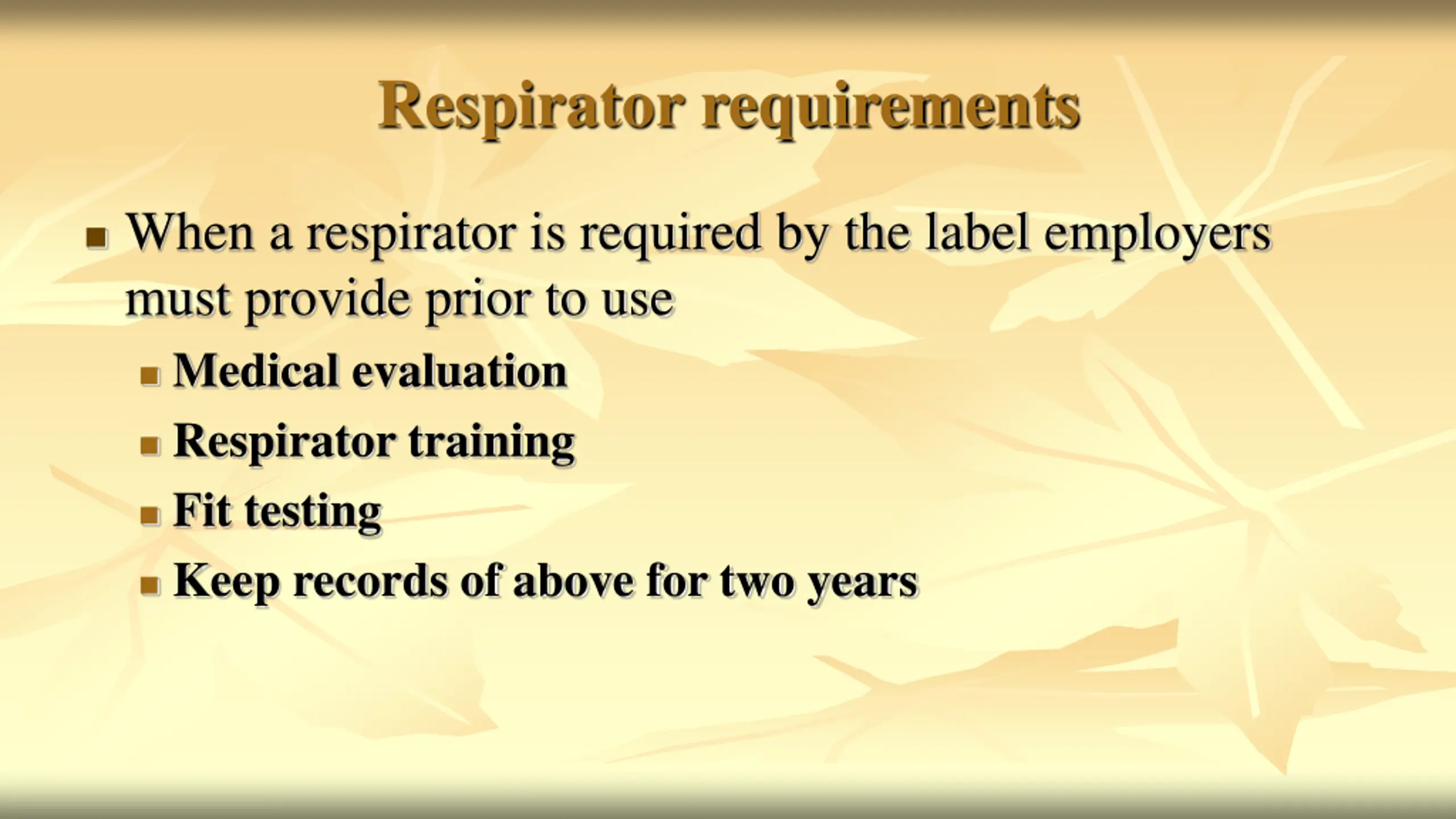Respirator requirements When a respirator is required by the label employers must provide prior to use Medical evaluation Respirator training Fit testing Keep records of above for two years