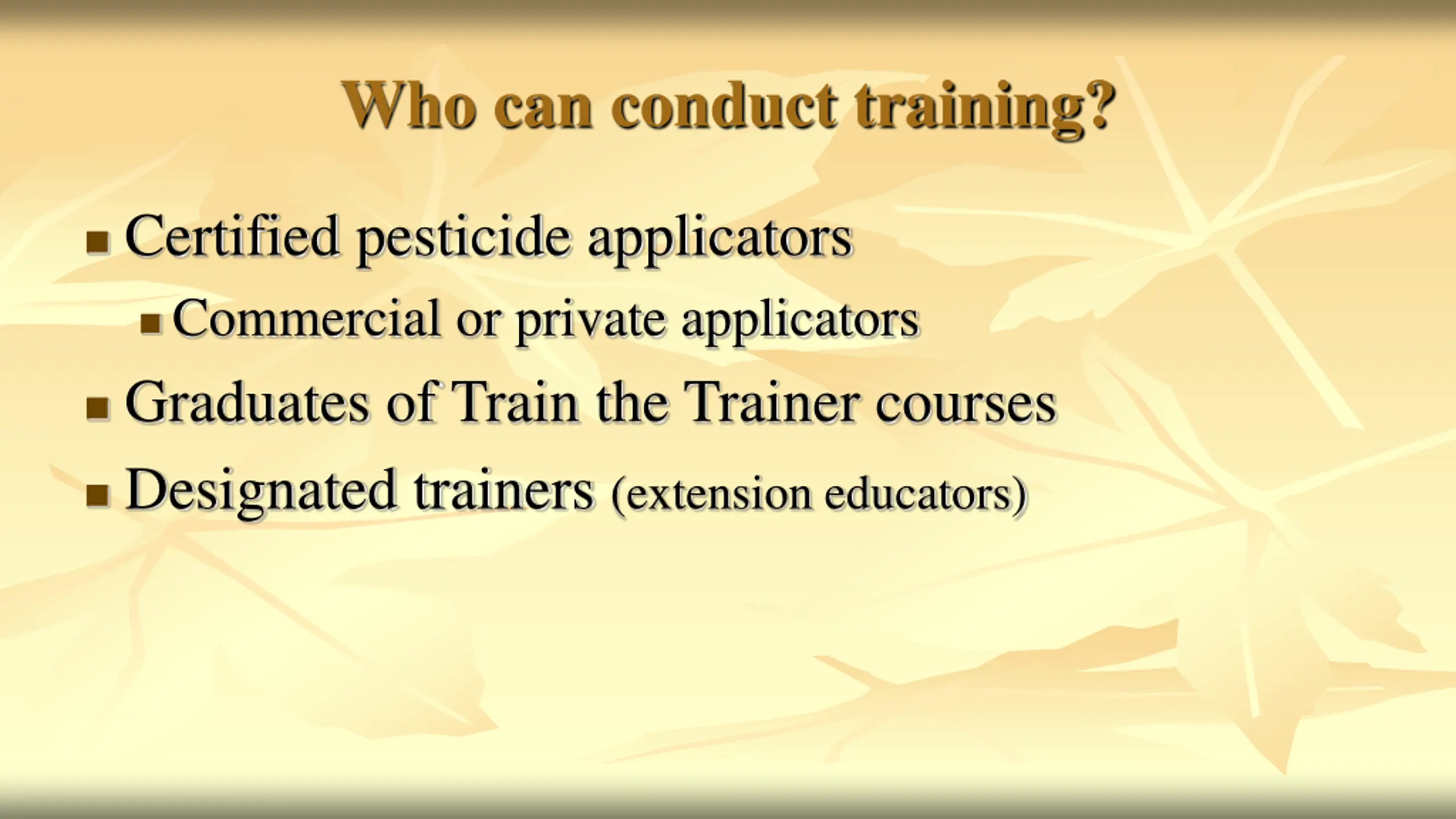 Who can conduct training? Certified pesticide applicators Commercial or private applicators Graduates of Train the Trainer courses Designated trainers (extension educators)