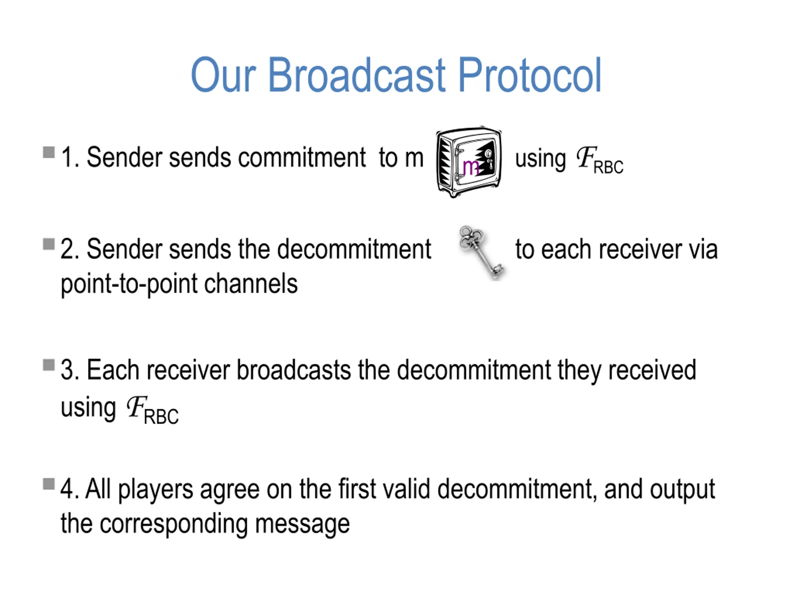 Our Broadcast Protocol 1. Sender sends commitment to m using FRBC m 2. Sender sends the decommitment to each receiver via point-to-point channels 3. Each receiver broadcasts the decommitment they received using FRBC 4. All players agree on the first valid decommitment, and output the corresponding message