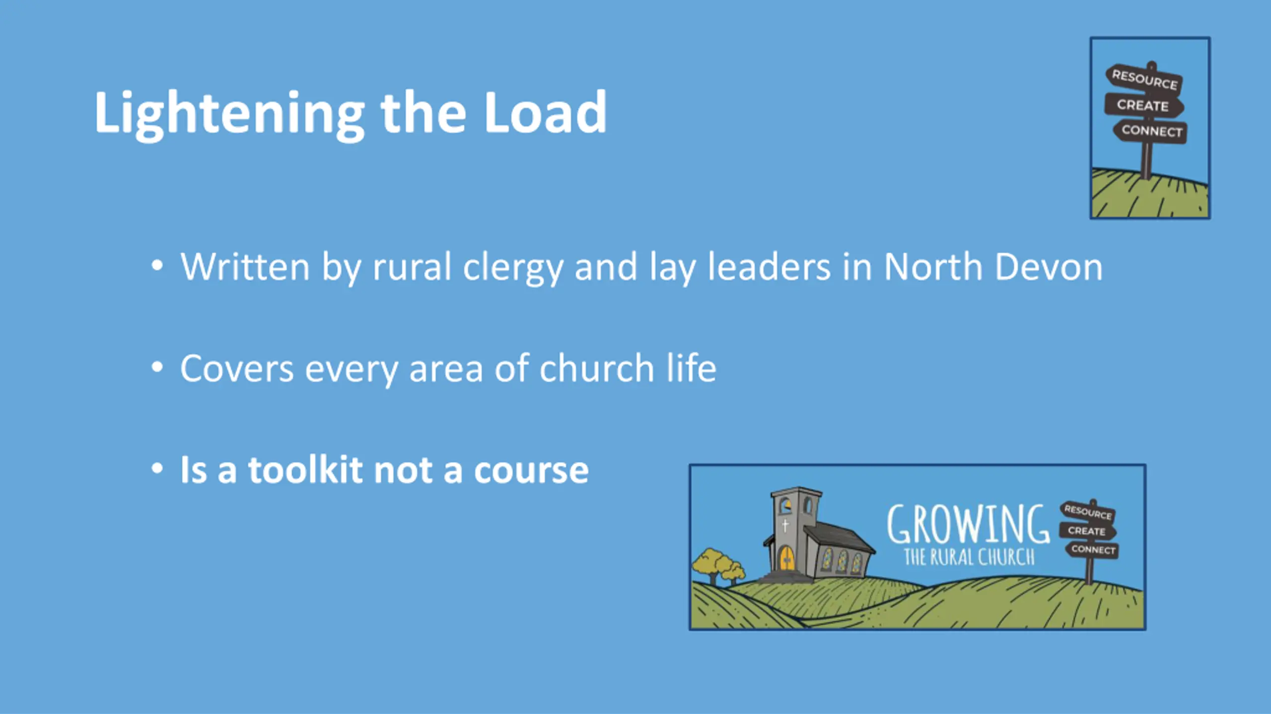 Lightening the Load Written by rural clergy and lay leaders in North Devon Covers every area of church life Is a toolkit not a course