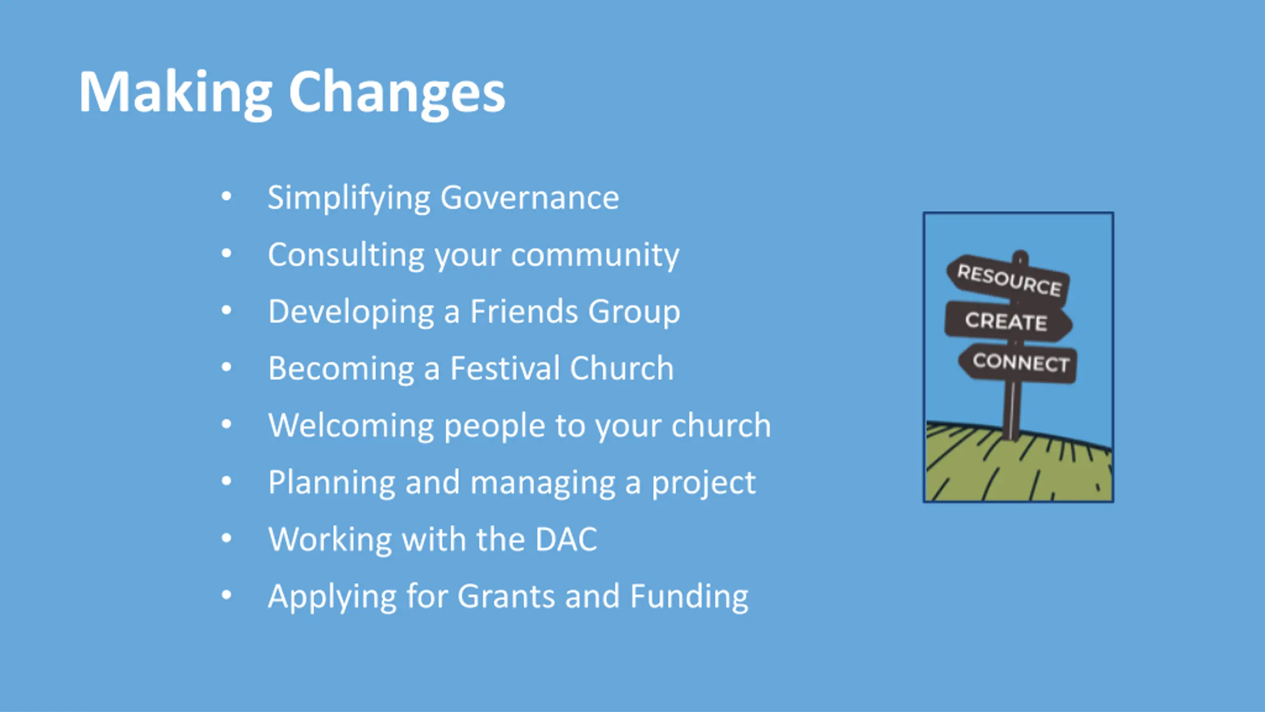 Making Changes Simplifying Governance Consulting your community Developing a Friends Group Becoming a Festival Church Welcoming people to your church Planning and managing a project Working with the DAC Applying for Grants and Funding