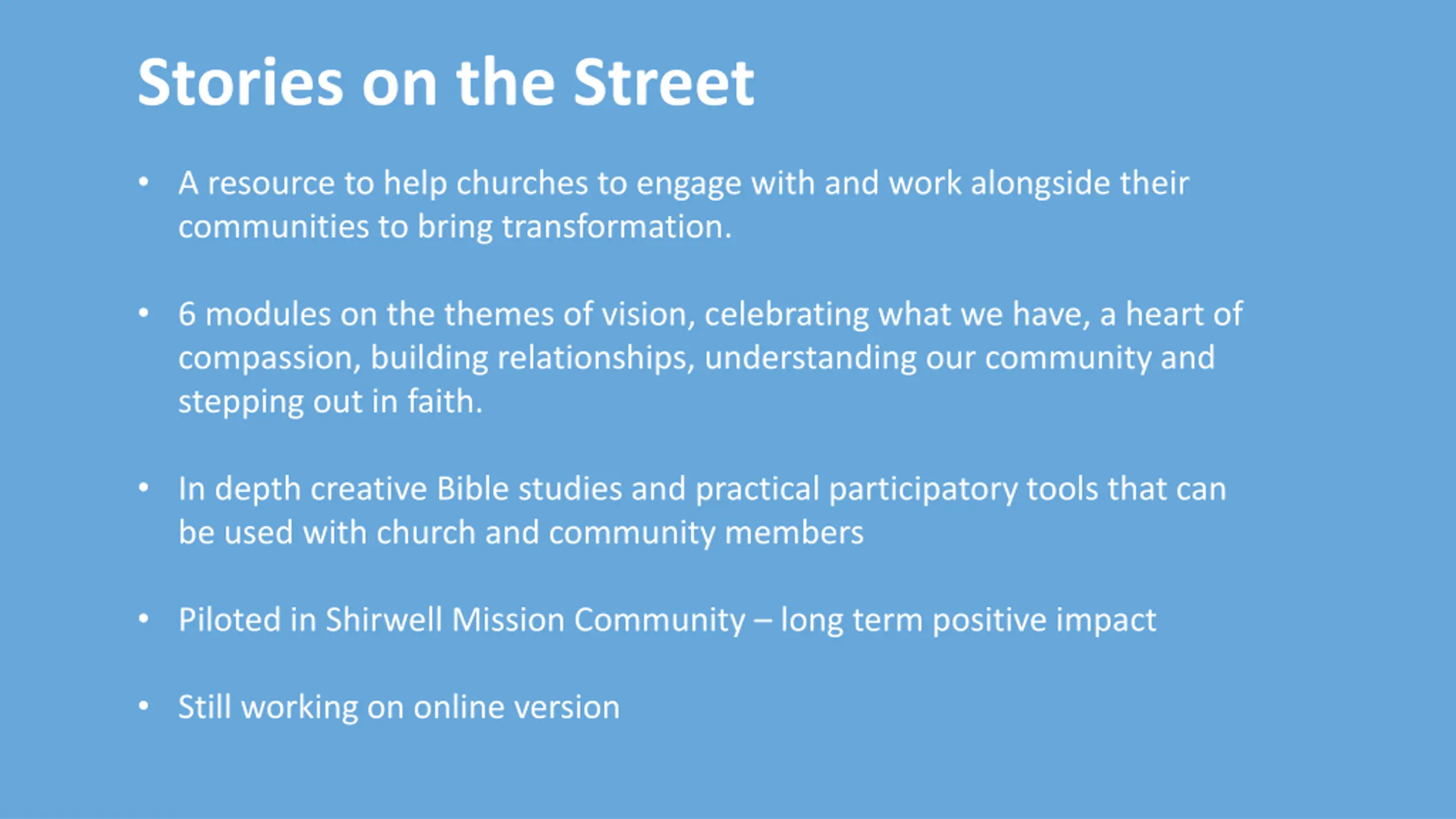 Stories on the Street A resource to help churches to engage with and work alongside their communities to bring transformation. 6 modules on the themes of vision, celebrating what we have, a heart of compassion, building relationships, understanding our community and stepping out in faith. In depth creative Bible studies and practical participatory tools that can be used with church and community members Piloted in Shirwell Mission Community long term positive impact Still working on online version