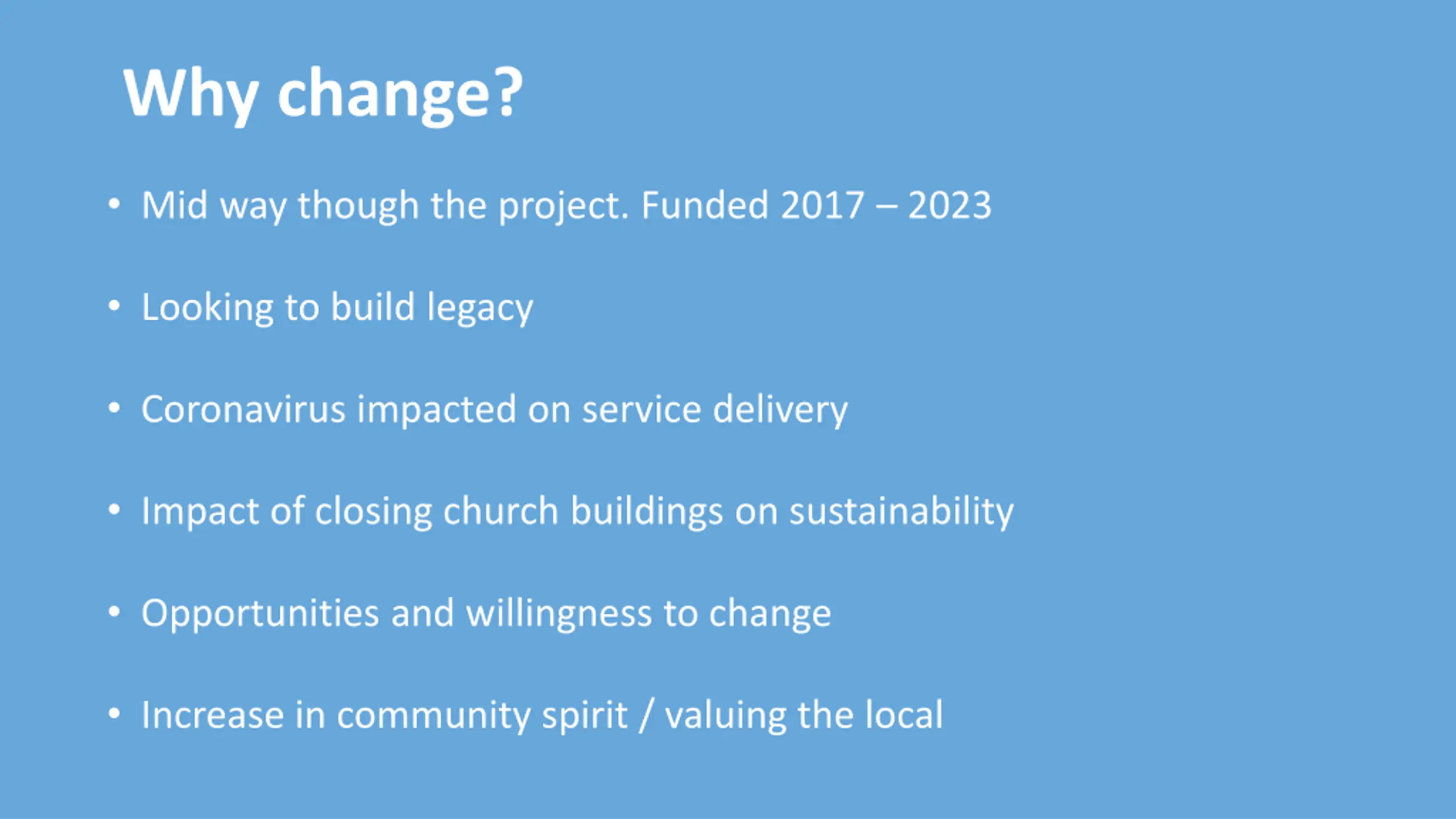 Why change? Mid way though the project. Funded 2017 2023 Looking to build legacy Coronavirus impacted on service delivery Impact of closing church buildings on sustainability Opportunities and willingness to change Increase in community spirit / valuing the local