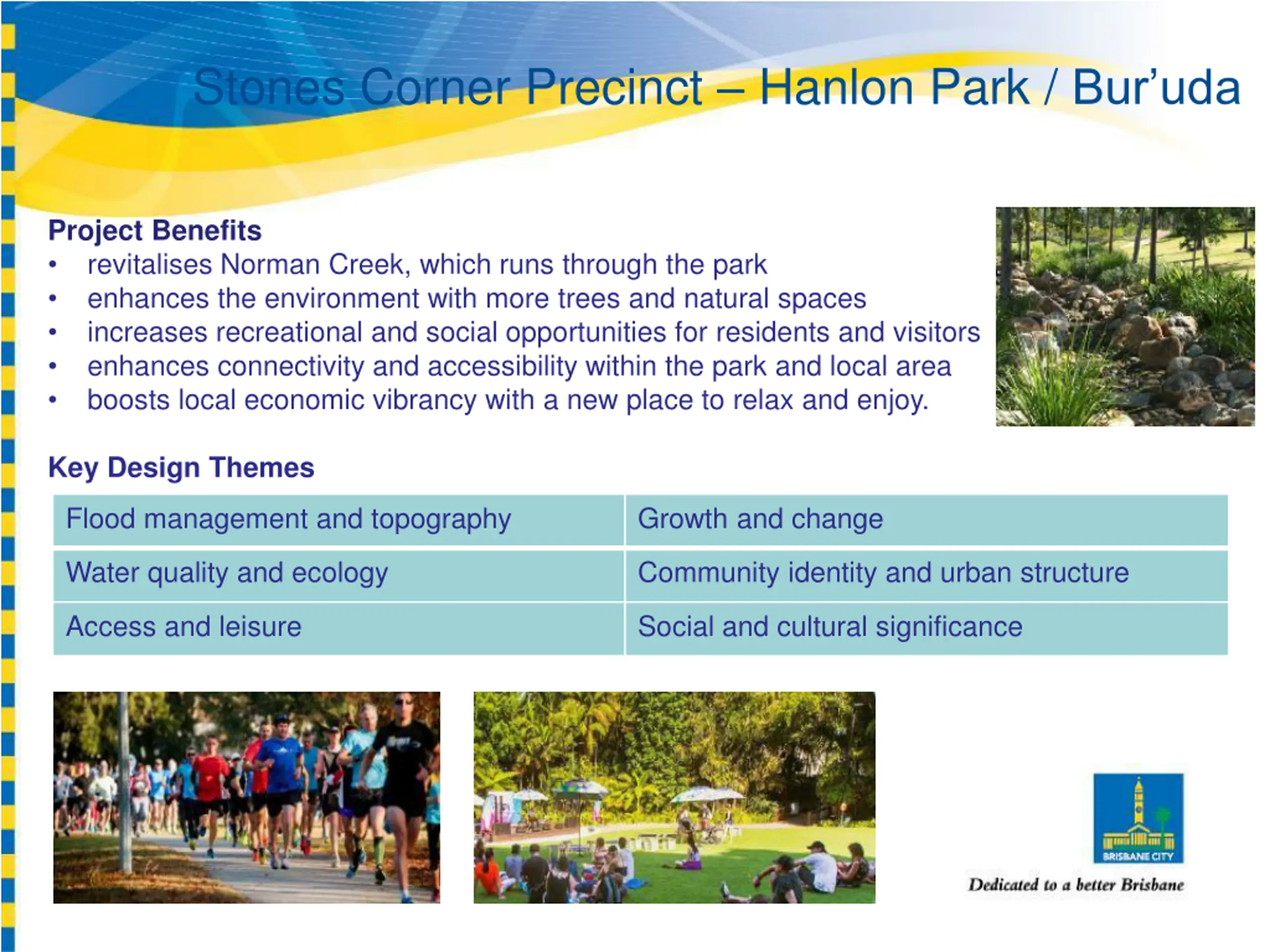 Stones Corner Precinct Hanlon Park / Buruda Project Benefits revitalises Norman Creek, which runs through the park enhances the environment with more trees and natural spaces increases recreational and social opportunities for residents and visitors enhances connectivity and accessibility within the park and local area boosts local economic vibrancy with a new place to relax and enjoy. Key Design Themes Flood management and topography Growth and change Water quality and ecology Community identity and urban structure Access and leisure Social and cultural significance