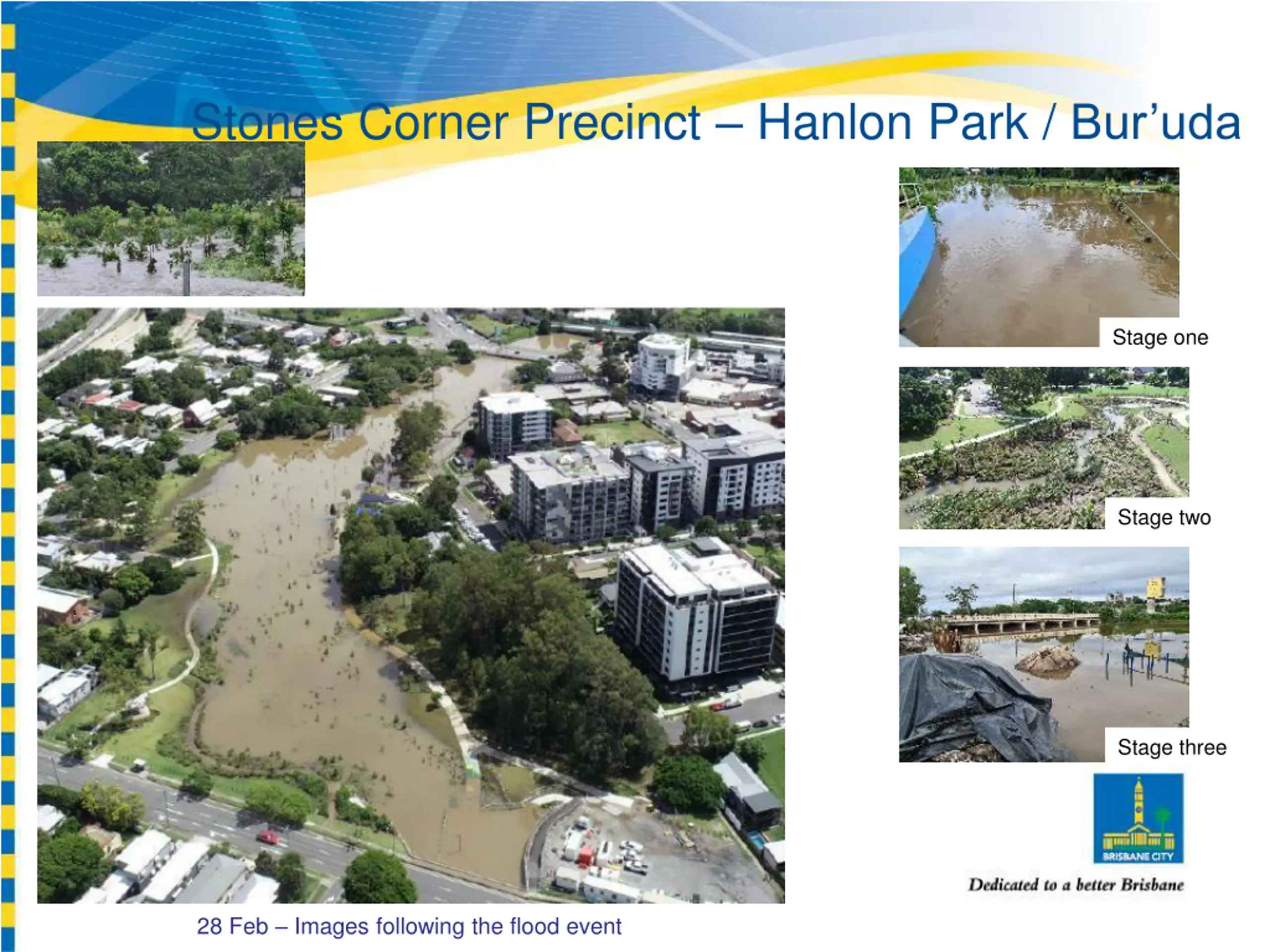 Stones Corner Precinct Hanlon Park / Buruda Stage one Stage two Stage three 28 Feb Images following the flood event