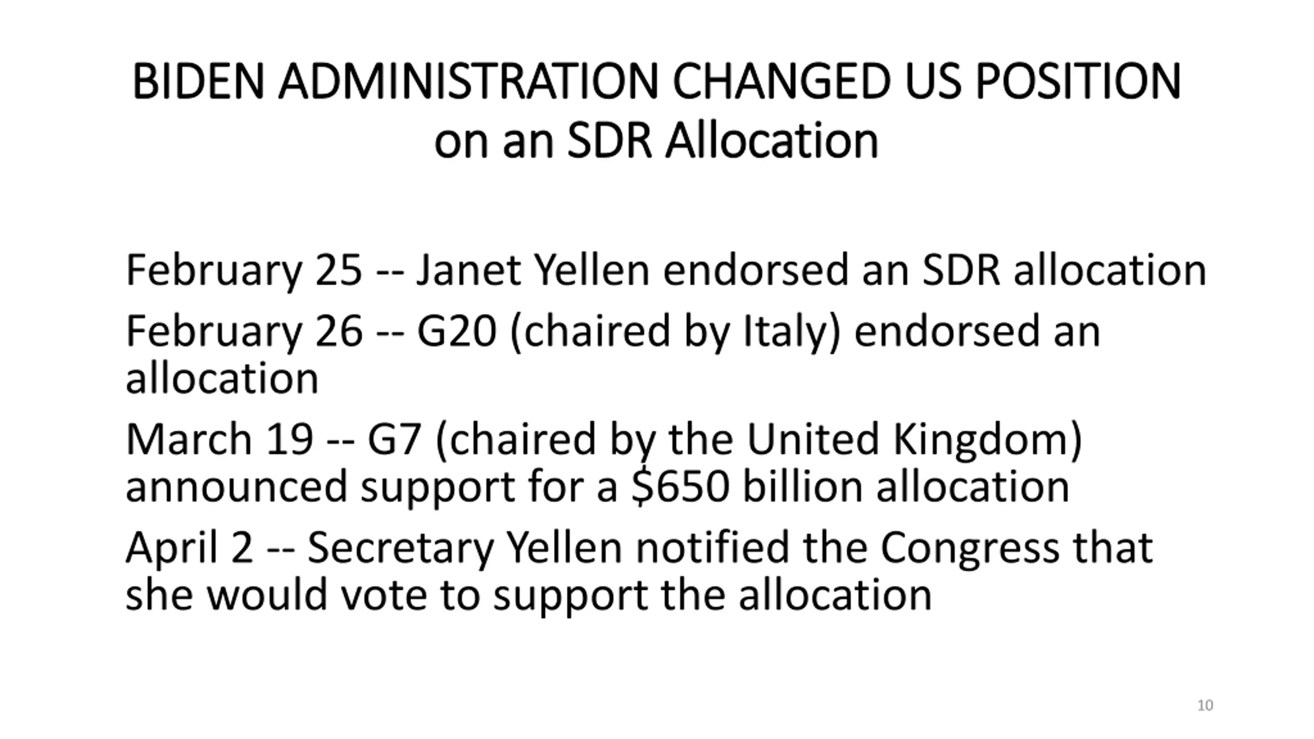 BIDEN ADMINISTRATION CHANGED US POSITION BIDEN ADMINISTRATION CHANGED US POSITION on an SDR Allocation on an SDR Allocation February 25 -- Janet Yellen endorsed an SDR allocation February 26 -- G20 (chaired by Italy) endorsed an allocation March 19 -- G7 (chaired by the United Kingdom) announced support for a $650 billion allocation April 2 -- Secretary Yellen notified the Congress that she would vote to support the allocation 10