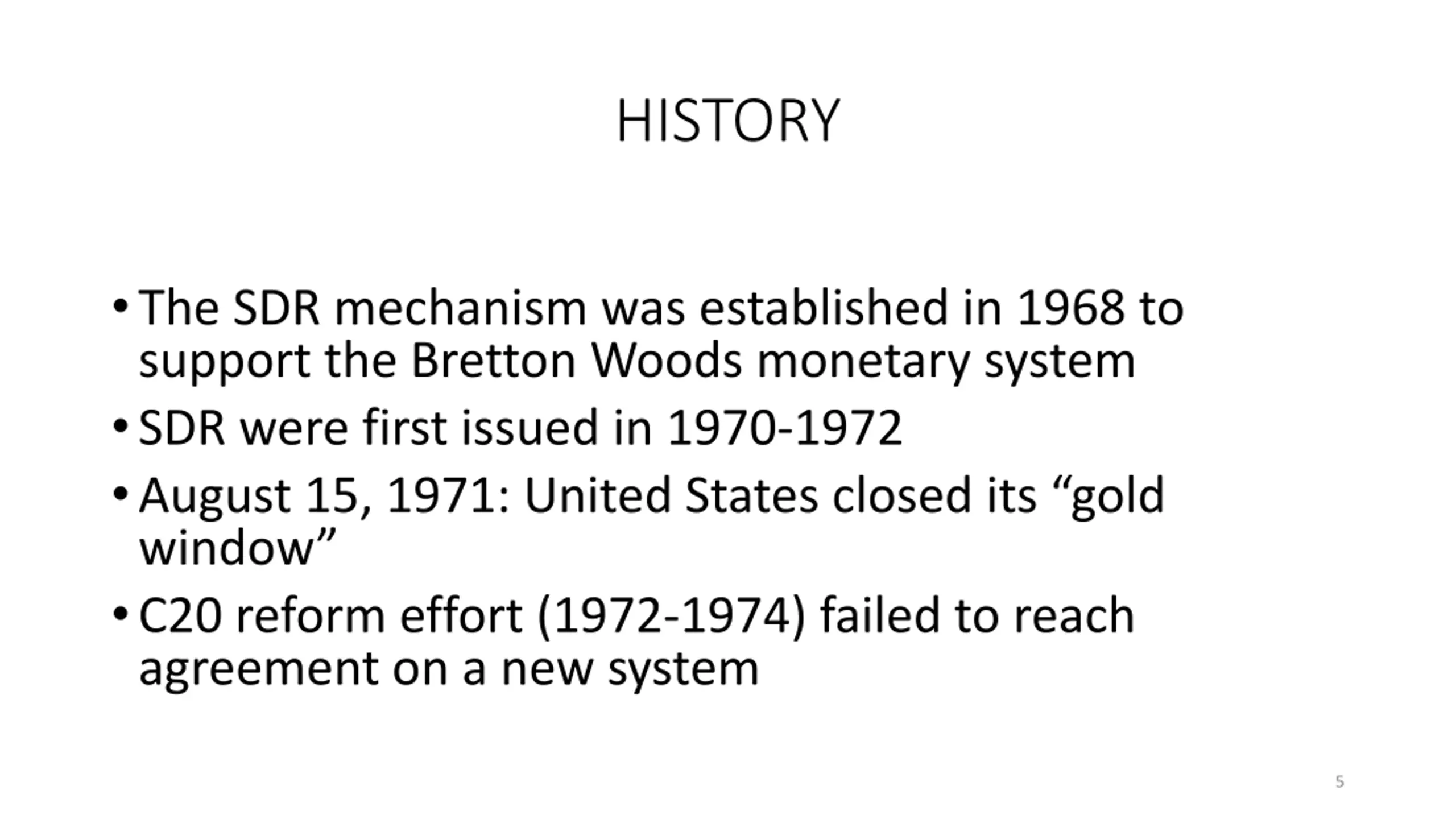 HISTORY The SDR mechanism was established in 1968 to support the Bretton Woods monetary system SDR were first issued in 1970-1972 August 15, 1971: United States closed its gold window C20 reform effort (1972-1974) failed to reach agreement on a new system 5