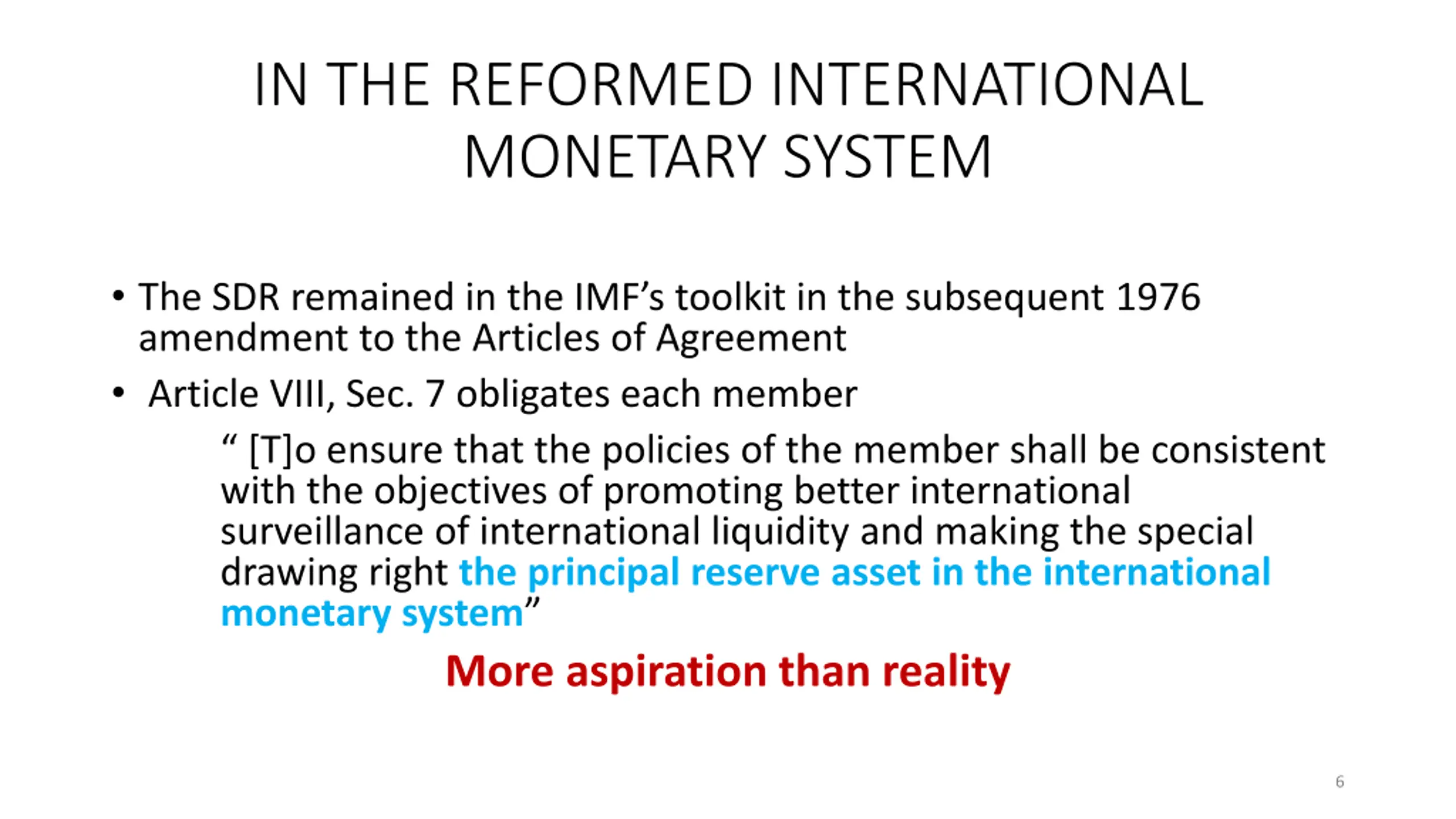 IN THE REFORMED INTERNATIONAL MONETARY SYSTEM The SDR remained in the IMF s toolkit in the subsequent 1976 amendment to the Articles of Agreement Article VIII, Sec. 7 obligates each member [T]o ensure that the policies of the member shall be consistent with the objectives of promoting better international surveillance of international liquidity and making the special drawing right the principal reserve asset in the international monetary system More aspiration than reality 6