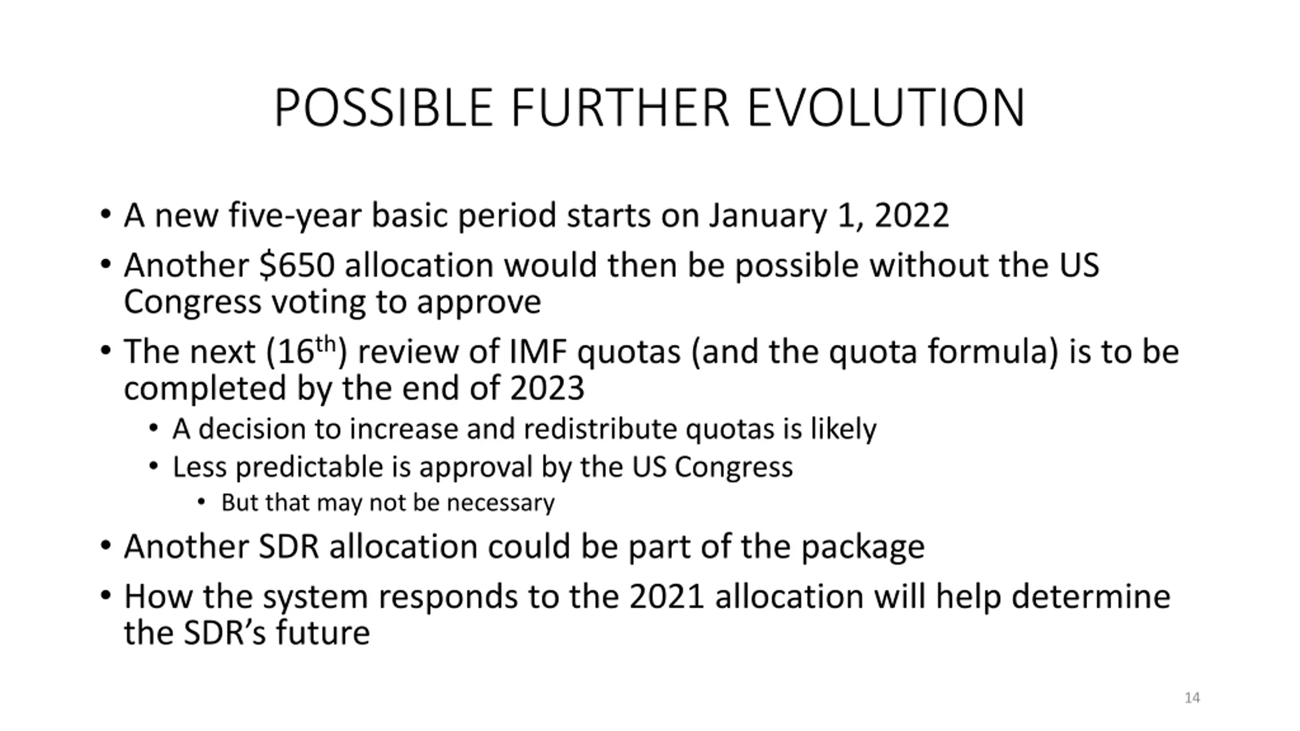 POSSIBLE FURTHER EVOLUTION A new five-year basic period starts on January 1, 2022 Another $650 allocation would then be possible without the US Congress voting to approve The next (16th) review of IMF quotas (and the quota formula) is to be completed by the end of 2023 A decision to increase and redistribute quotas is likely Less predictable is approval by the US Congress But that may not be necessary Another SDR allocation could be part of the package How the system responds to the 2021 allocation will help determine the SDR s future 14