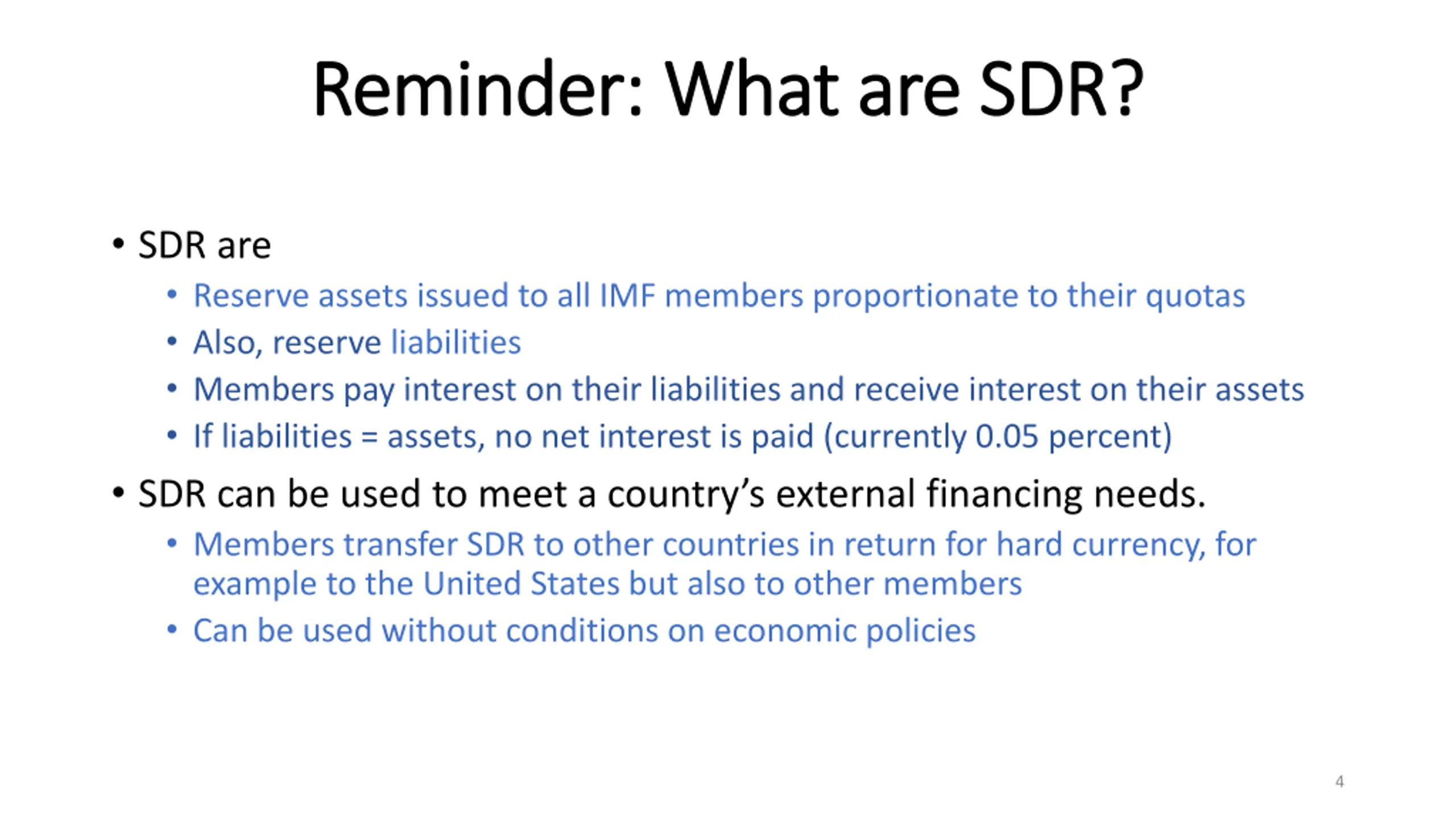 Reminder: What are SDR? Reminder: What are SDR? SDR are Reserve assets issued to all IMF members proportionate to their quotas Also, reserve liabilities Members pay interest on their liabilities and receive interest on their assets If liabilities = assets, no net interest is paid (currently 0.05 percent) SDR can be used to meet a country s external financing needs. Members transfer SDR to other countries in return for hard currency, for example to the United States but also to other members Can be used without conditions on economic policies 4