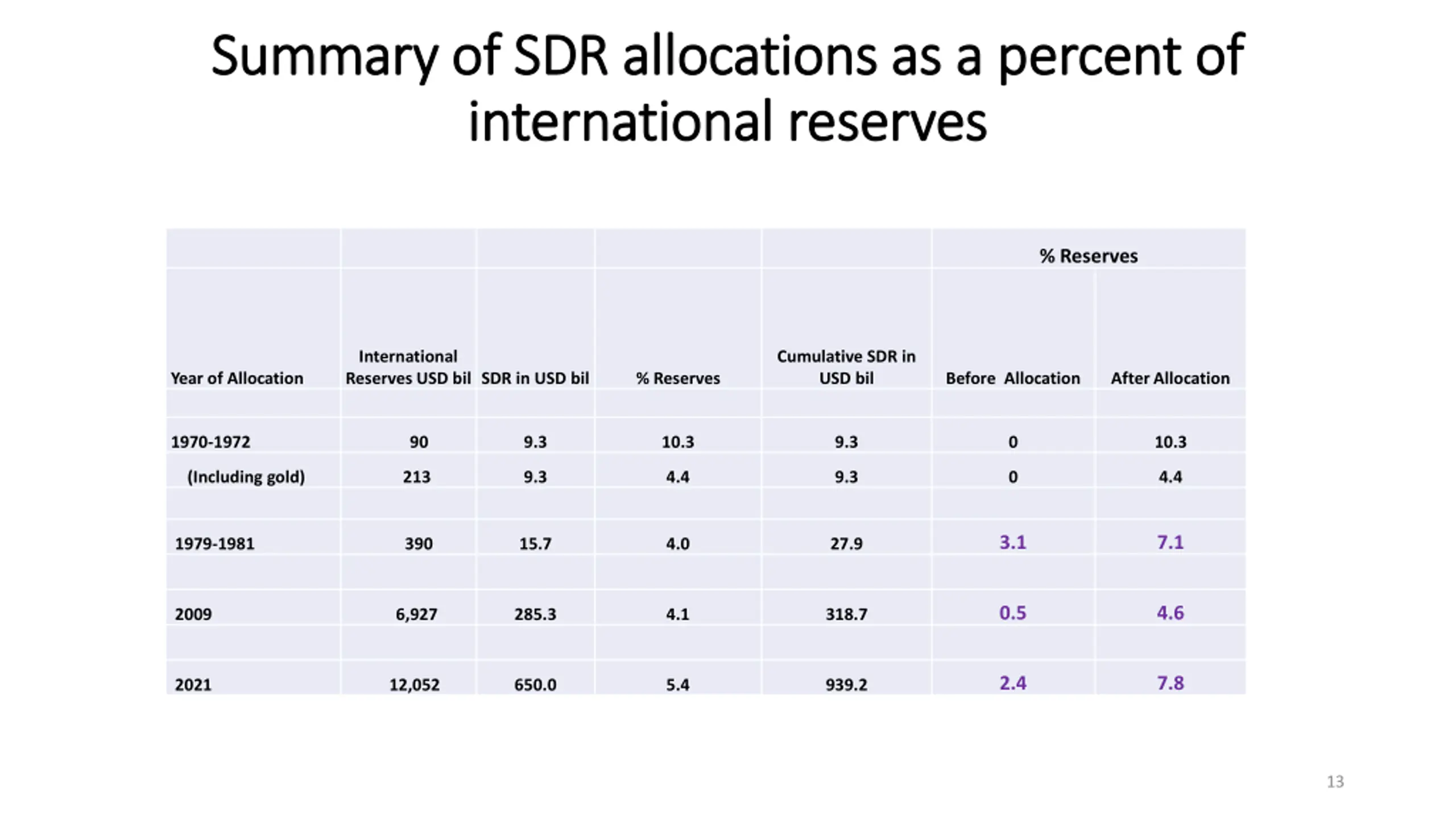 Summary of SDR allocations as a percent of Summary of SDR allocations as a percent of international reserves international reserves % Reserves International Reserves USD bil SDR in USD bil Cumulative SDR in USD bil Year of Allocation % Reserves Before Allocation After Allocation 1970-1972 90 9.3 10.3 9.3 0 10.3 (Including gold) 213 9.3 4.4 9.3 0 4.4 3.1 7.1 1979-1981 390 15.7 4.0 27.9 0.5 4.6 2009 6,927 285.3 4.1 318.7 2.4 7.8 2021 12,052 650.0 5.4 939.2 13