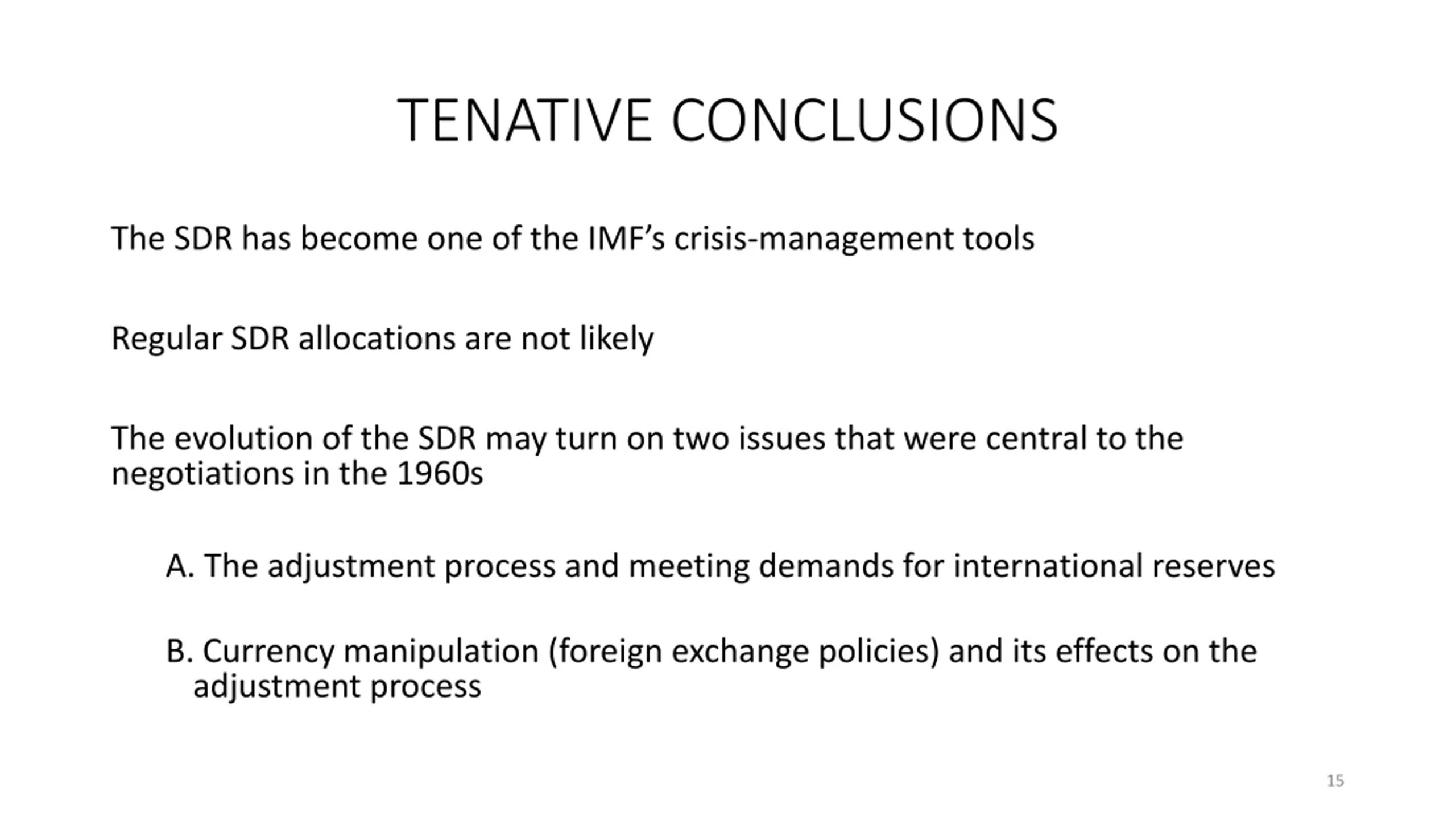 TENATIVE CONCLUSIONS The SDR has become one of the IMF s crisis-management tools Regular SDR allocations are not likely The evolution of the SDR may turn on two issues that were central to the negotiations in the 1960s A. The adjustment process and meeting demands for international reserves B. Currency manipulation (foreign exchange policies) and its effects on the adjustment process 15