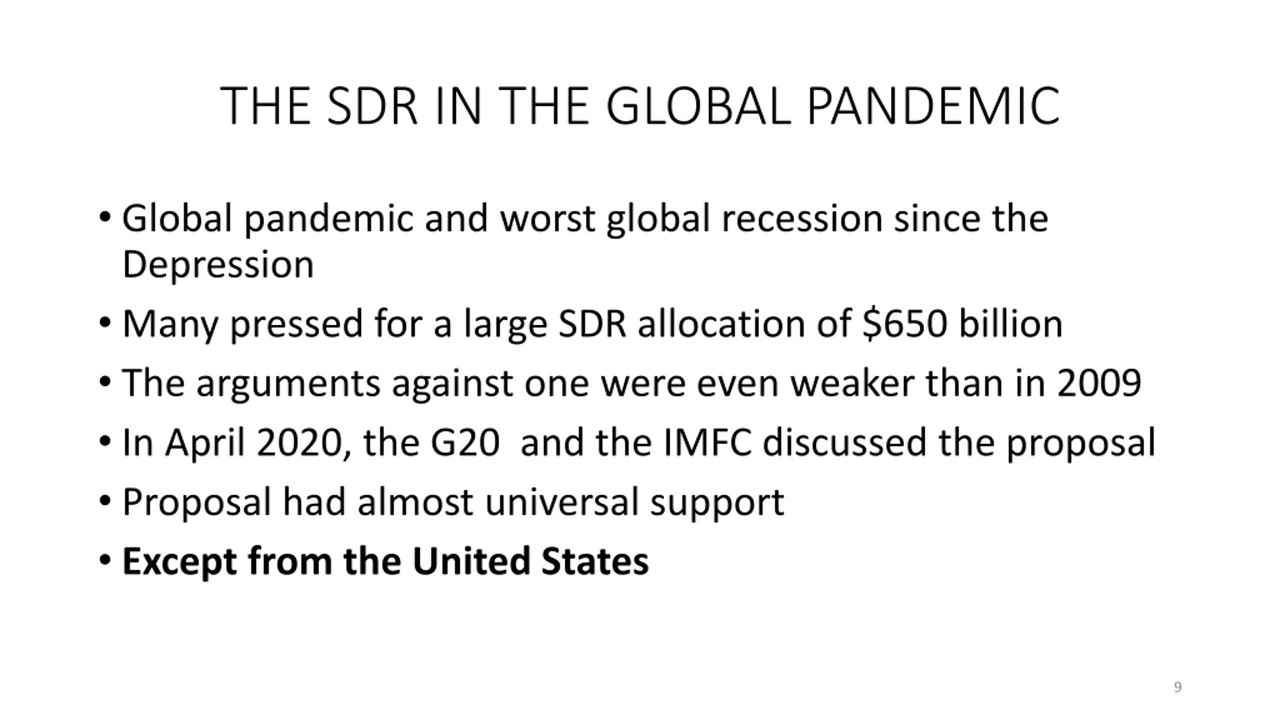 THE SDR IN THE GLOBAL PANDEMIC Global pandemic and worst global recession since the Depression Many pressed for a large SDR allocation of $650 billion The arguments against one were even weaker than in 2009 In April 2020, the G20 and the IMFC discussed the proposal Proposal had almost universal support Except from the United States 9