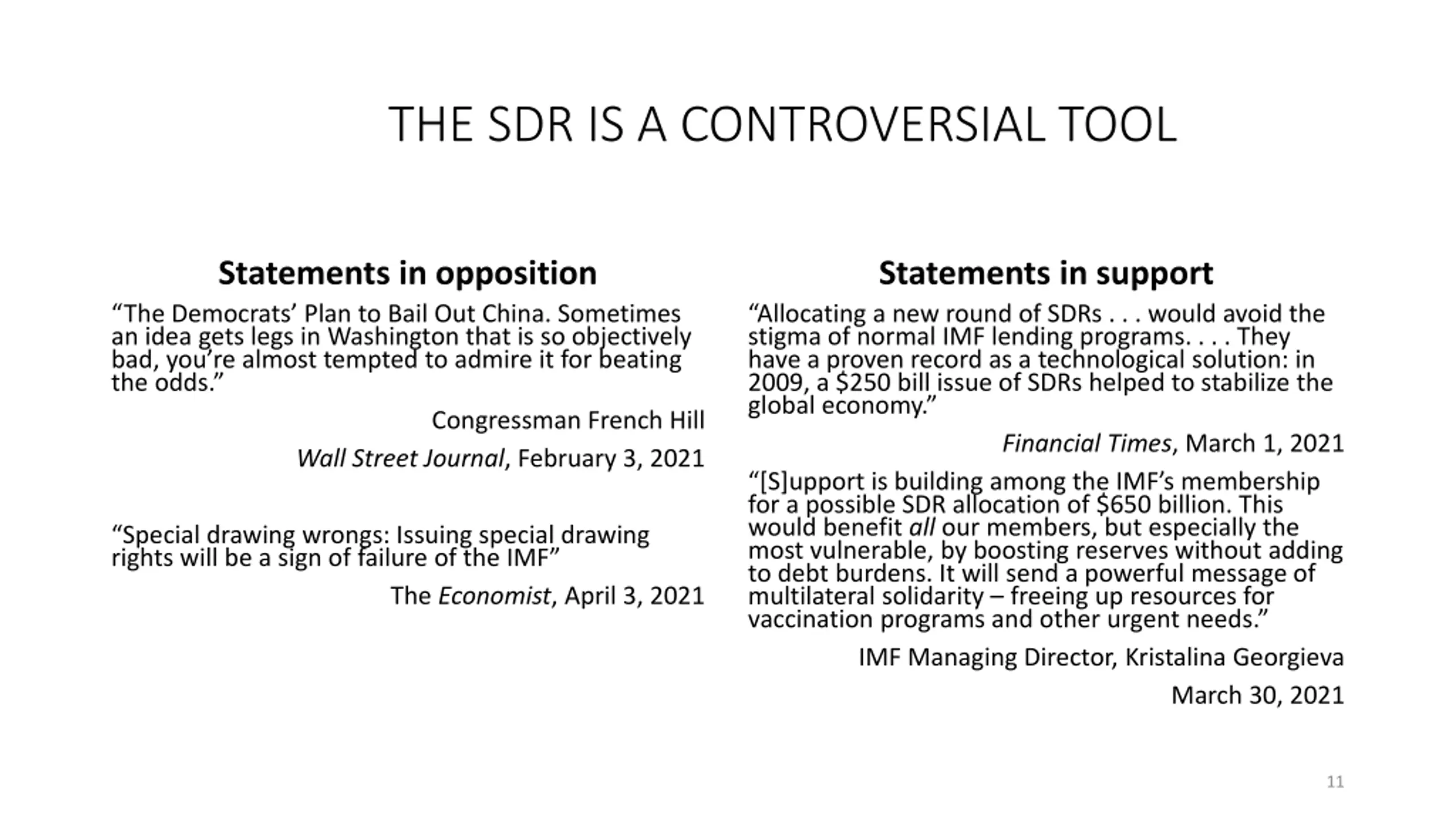 THE SDR IS A CONTROVERSIAL TOOL Statements in opposition The Democrats Plan to Bail Out China. Sometimes an idea gets legs in Washington that is so objectively bad, you re almost tempted to admire it for beating the odds. Statements in support Allocating a new round of SDRs . . . would avoid the stigma of normal IMF lending programs. . . . They have a proven record as a technological solution: in 2009, a $250 bill issue of SDRs helped to stabilize the global economy. Financial Times, March 1, 2021 [S]upport is building among the IMF s membership for a possible SDR allocation of $650 billion. This would benefit all our members, but especially the most vulnerable, by boosting reserves without adding to debt burdens. It will send a powerful message of multilateral solidarity freeing up resources for vaccination programs and other urgent needs. IMF Managing Director, Kristalina Georgieva Congressman French Hill Wall Street Journal,February 3, 2021 Special drawing wrongs: Issuing special drawing rights will be a sign of failure of the IMF The Economist, April 3, 2021 March 30, 2021 11
