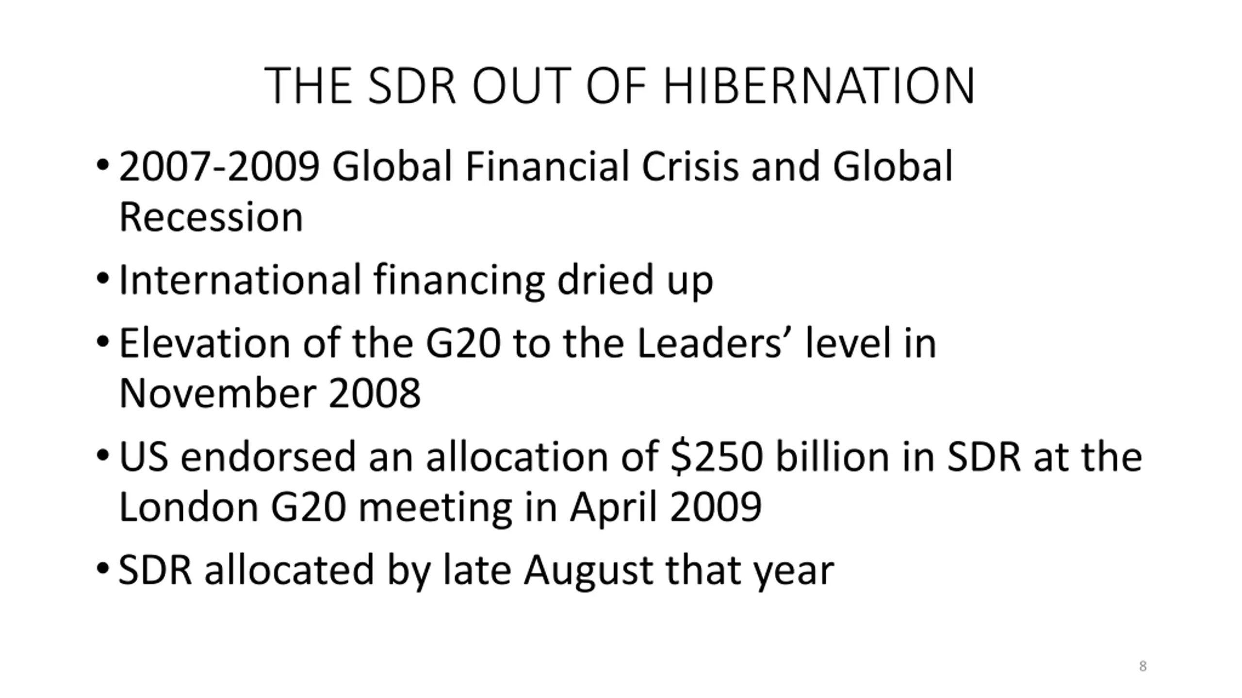 THE SDR OUT OF HIBERNATION 2007-2009 Global Financial Crisis and Global Recession International financing dried up Elevation of the G20 to the Leaders level in November 2008 US endorsed an allocation of $250 billion in SDR at the London G20 meeting in April 2009 SDR allocated by late August that year 8